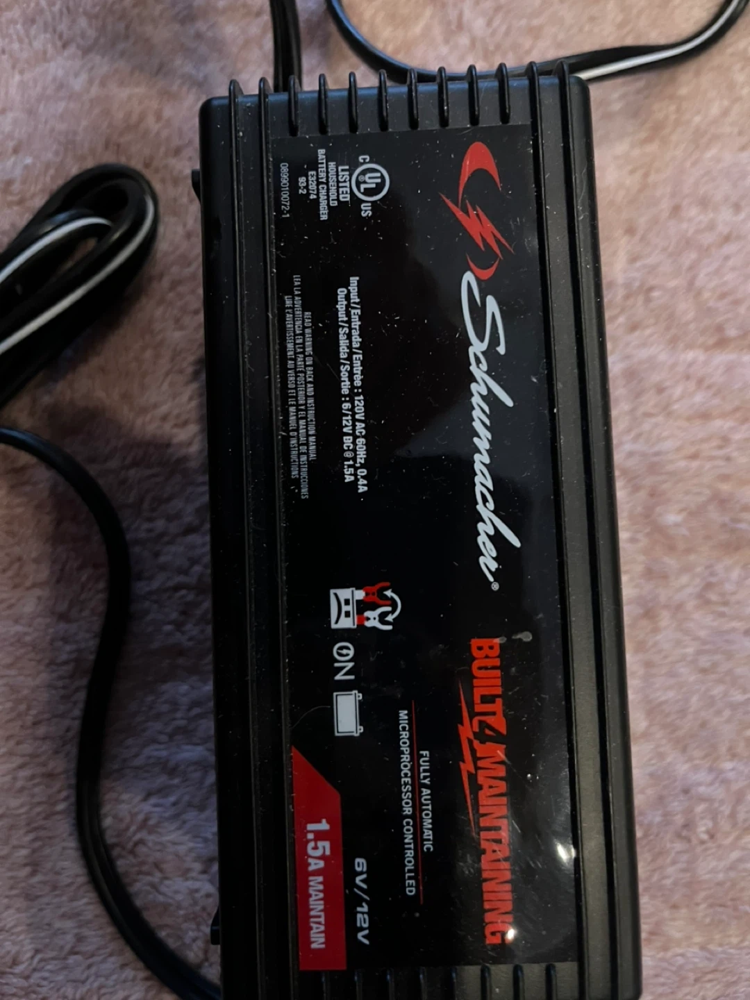 This is a Schumacher BCI 5A microprocessor-controlled battery charger. It's fully automatic and maintains 6V/12V batteries. Comes with a power cord and clamps.