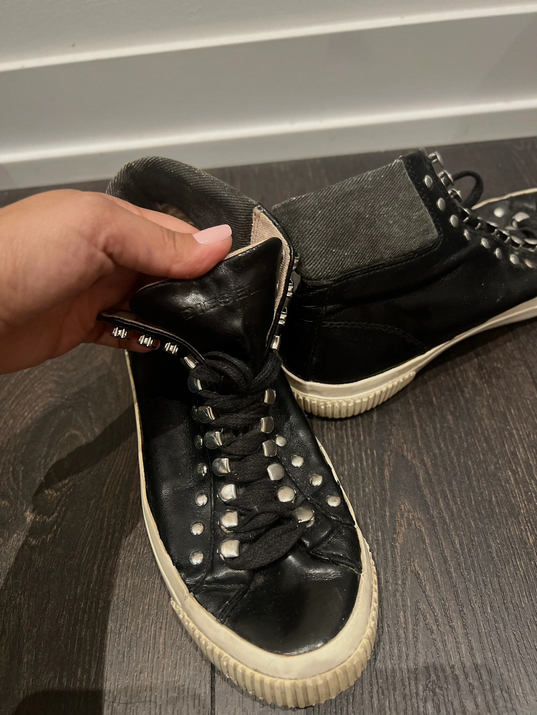 These black high-top sneakers with metal studs and black laces are a stylish and edgy addition to your collection. In good condition, they are perfect for rainy days, offering both fashion and functionality with their white rubber soles.