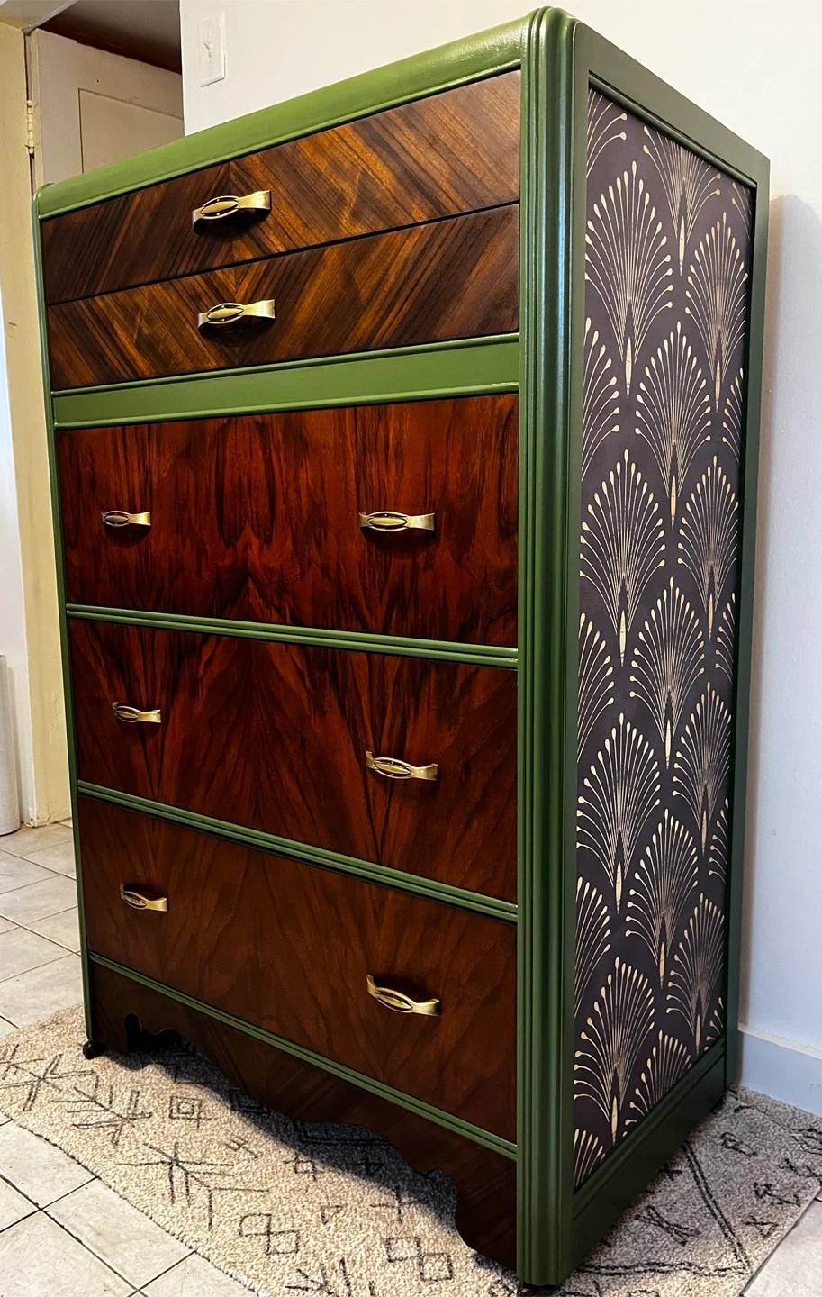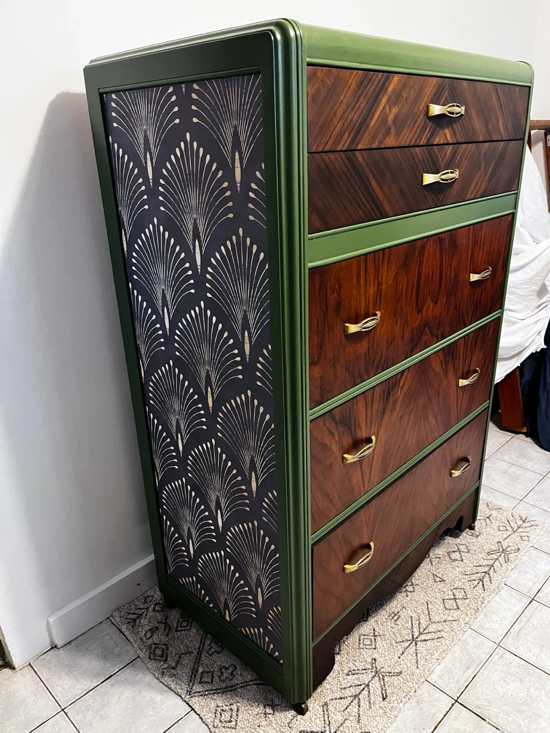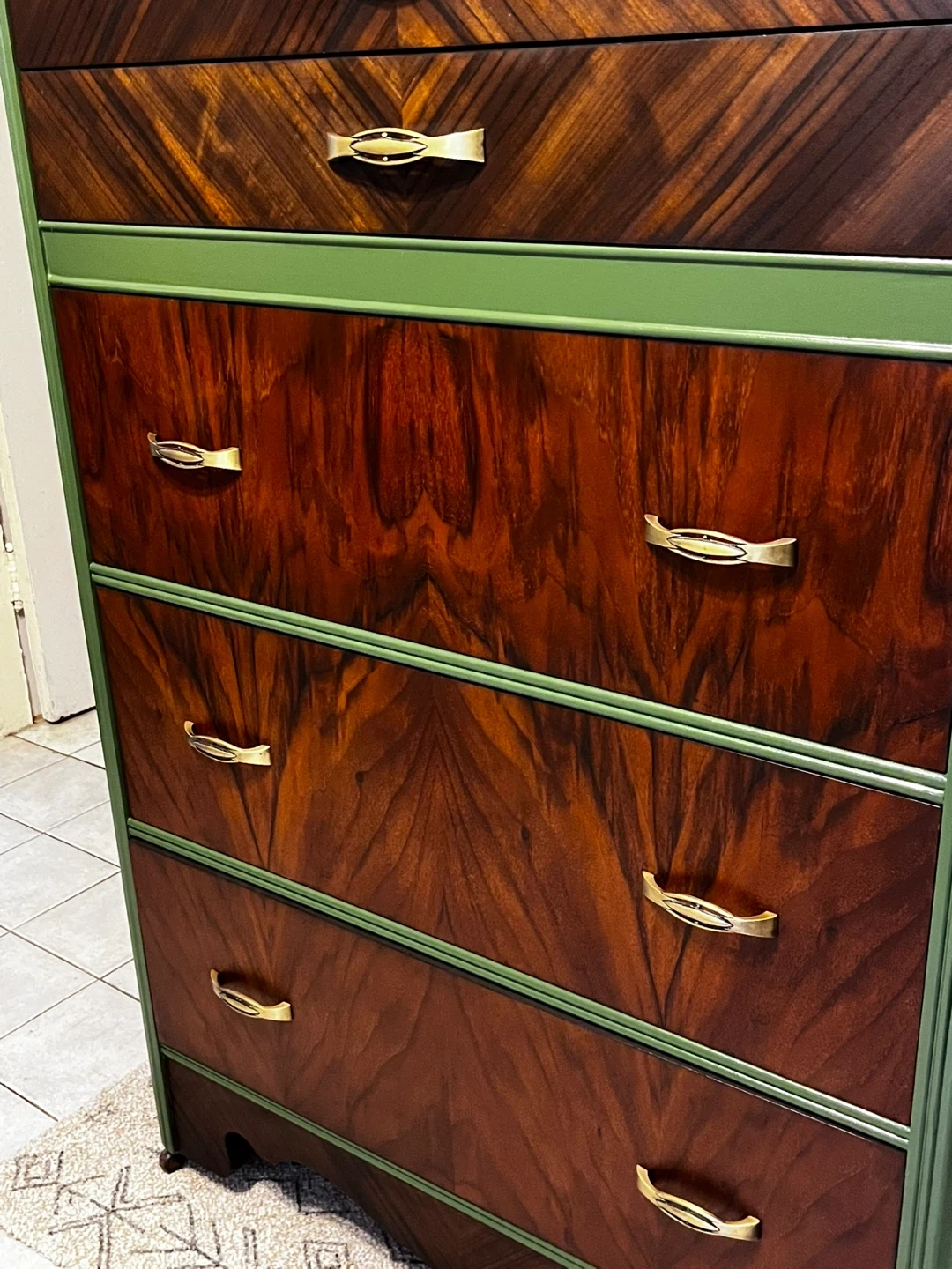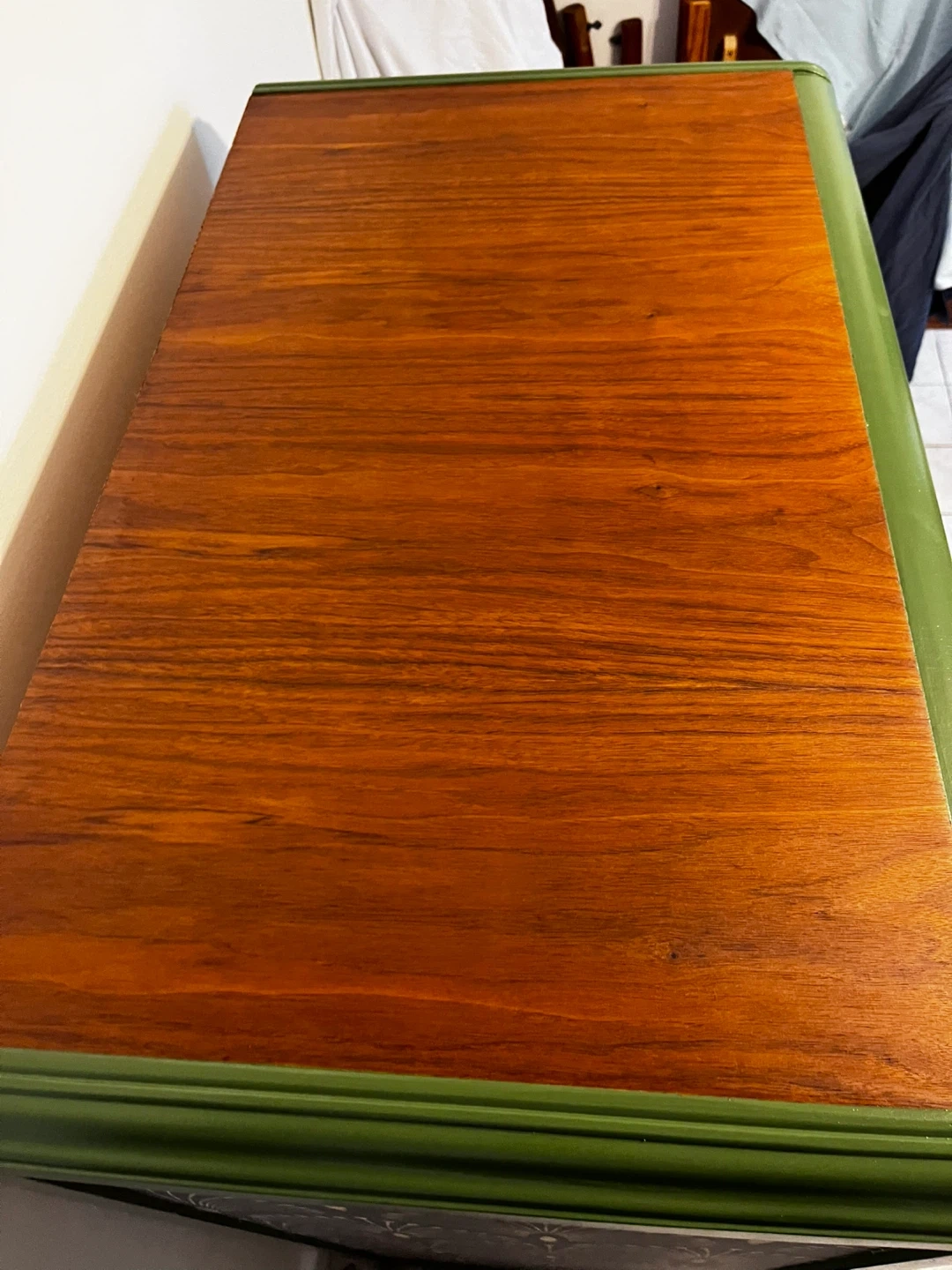 Refinished using danish oil to bring out the natural wood grain/tones. Paired with a good quality melamine based deep fresh green paint. High quality fun wall papered sides. This dresser will last a life time and some. Timeless piece that would go with any decor. Firm price Cash Only