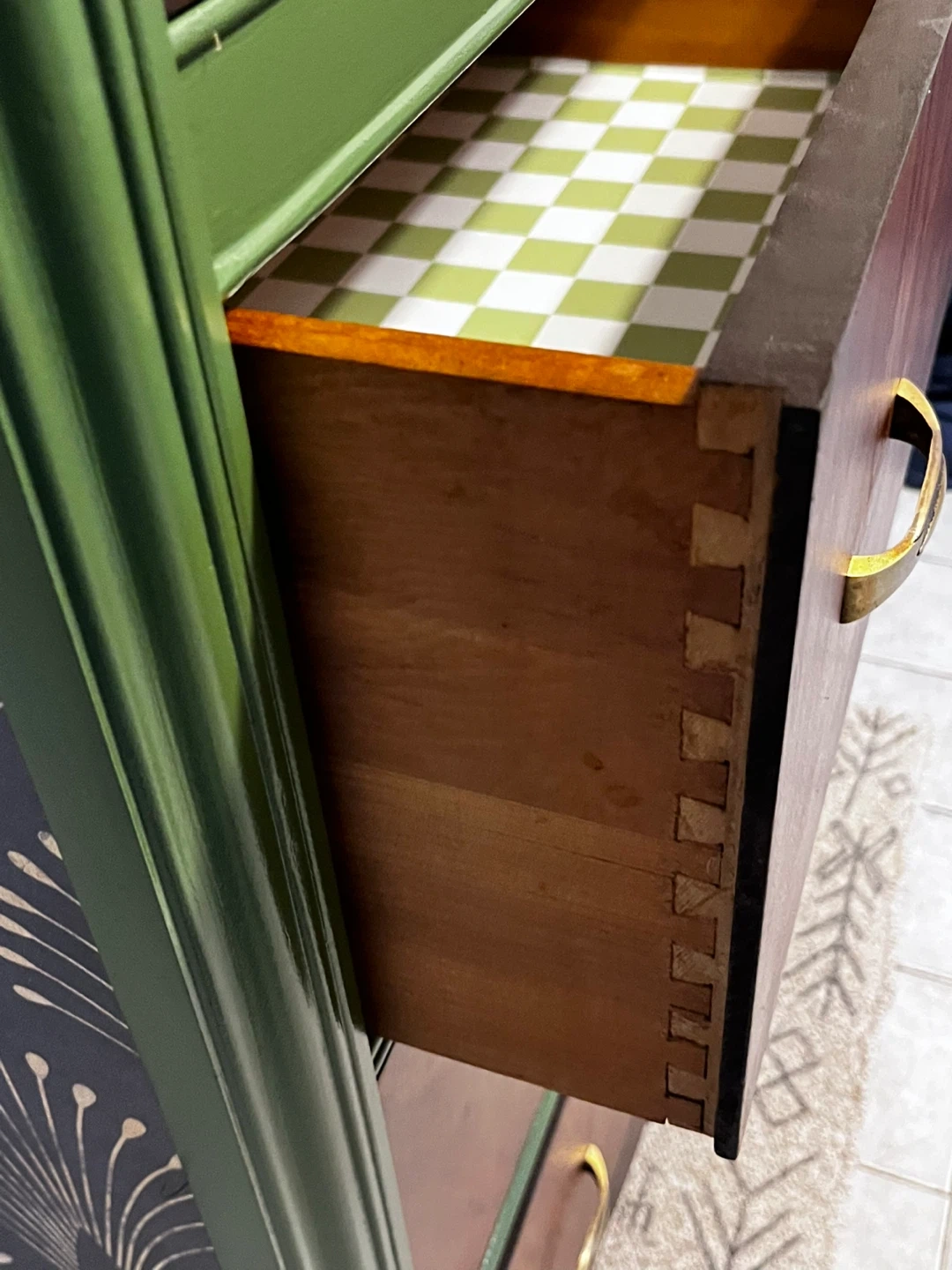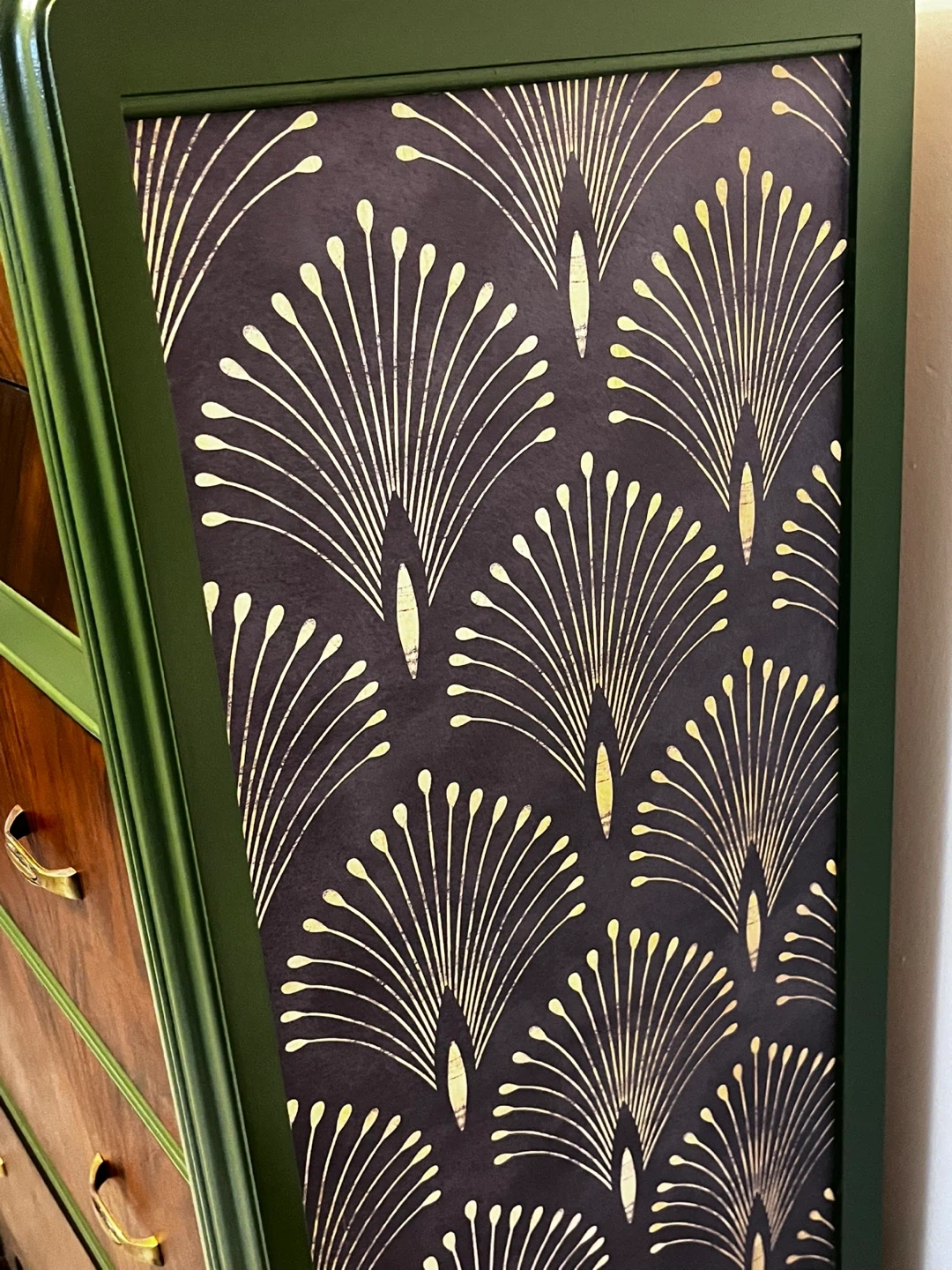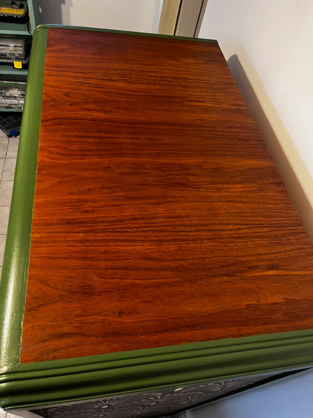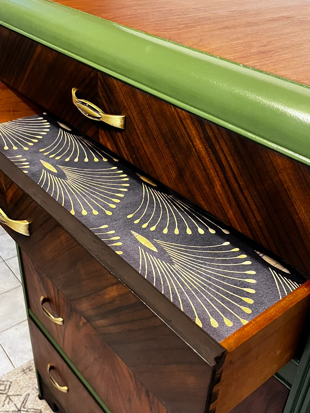 Refinished using danish oil to bring out the natural wood grain/tones. Paired with a good quality melamine based deep fresh green paint. High quality fun wall papered sides. This dresser will last a life time and some. Timeless piece that would go with any decor. Firm price Cash Only
