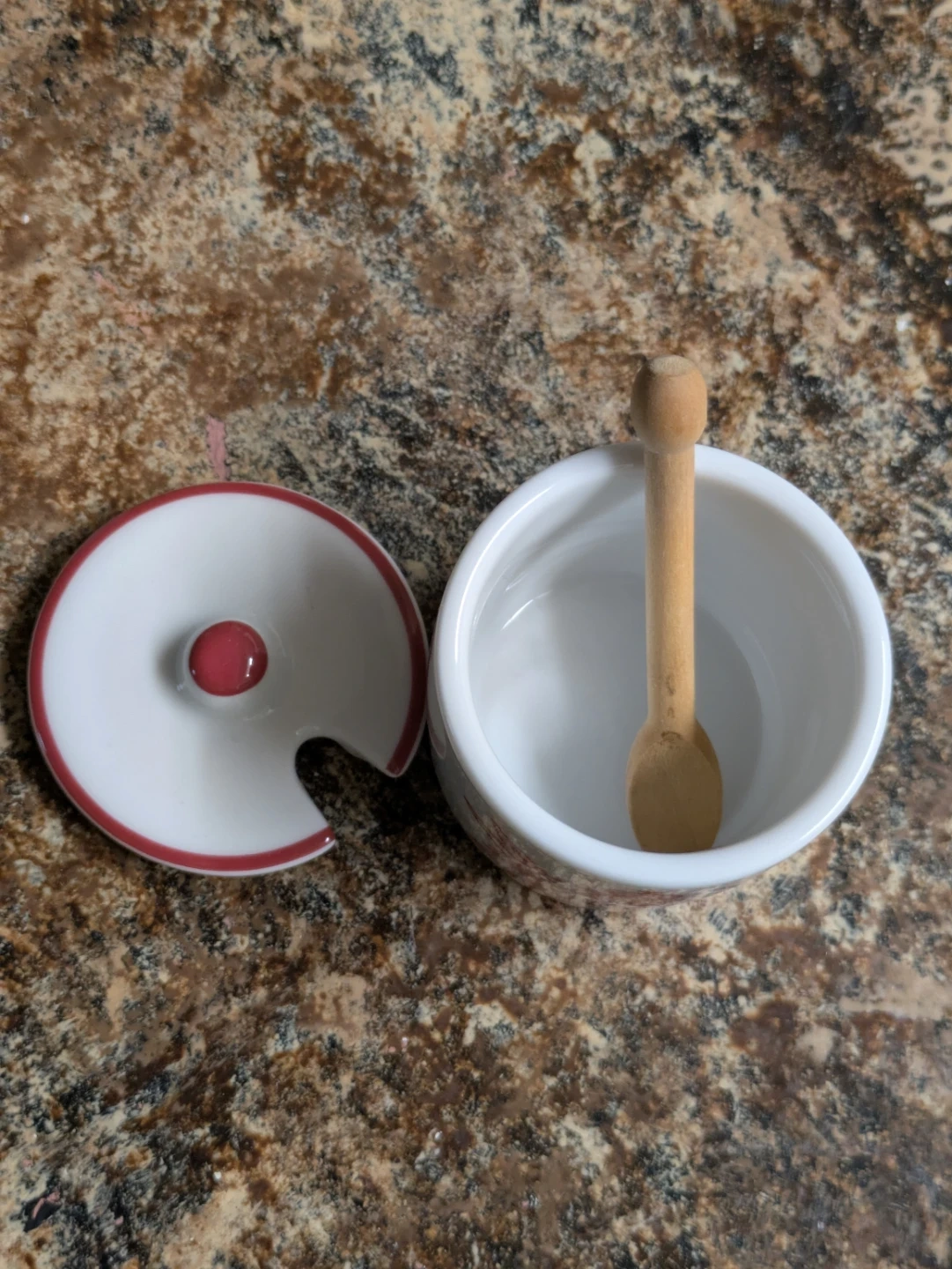 This is a vintage Maille mustard pot for Moutarde Fine de Dijon. It's made of ceramic and comes with a small wooden spoon. The pot features the Maille crest. Perfect for serving mustard at the table!