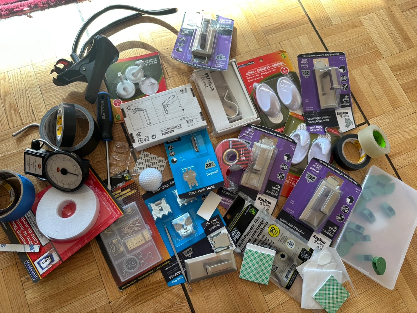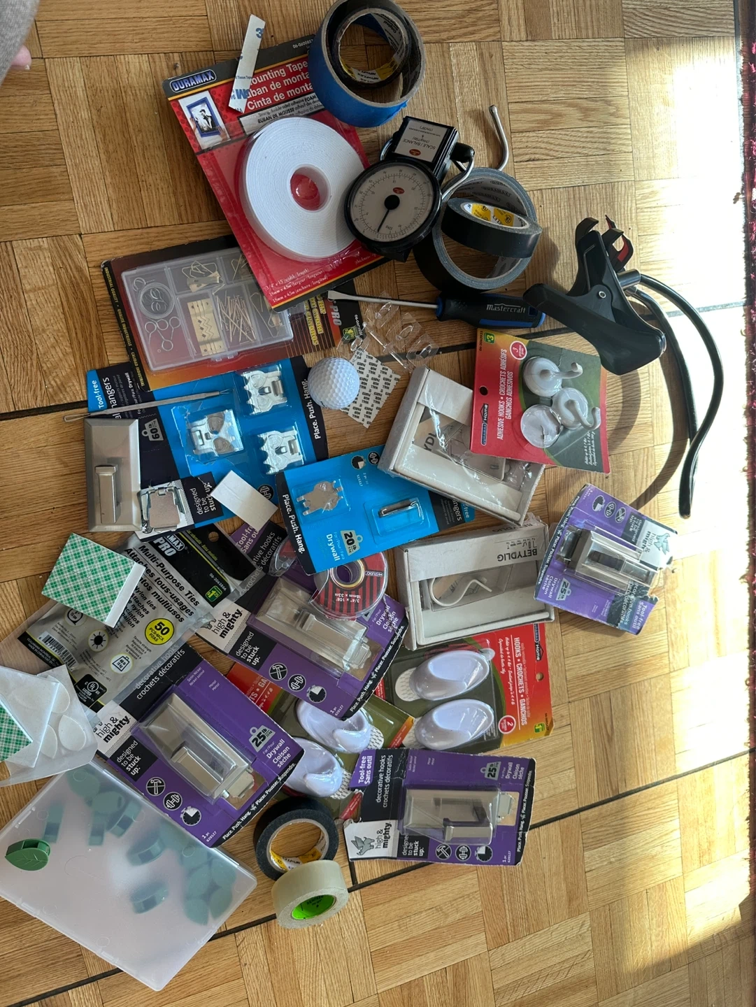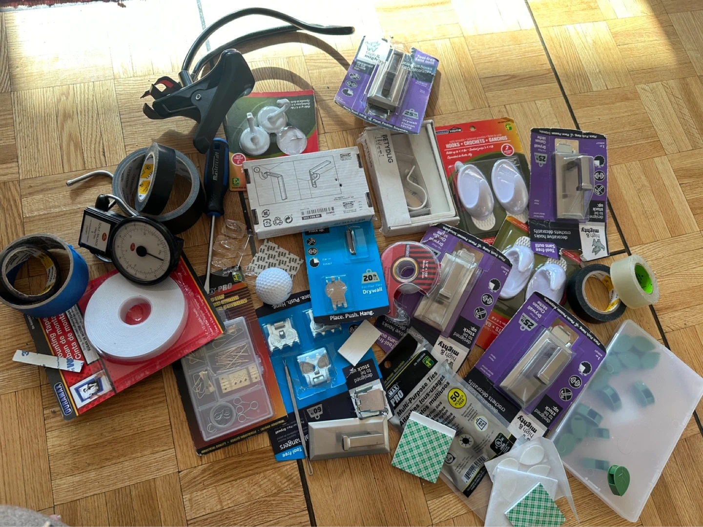 All for 5 dollars A collection of various home hardware items including command strips, mounting hooks, tape, and fasteners. Ideal for organizing and hanging various items around the house. Ikea door locks