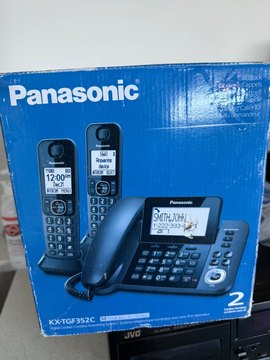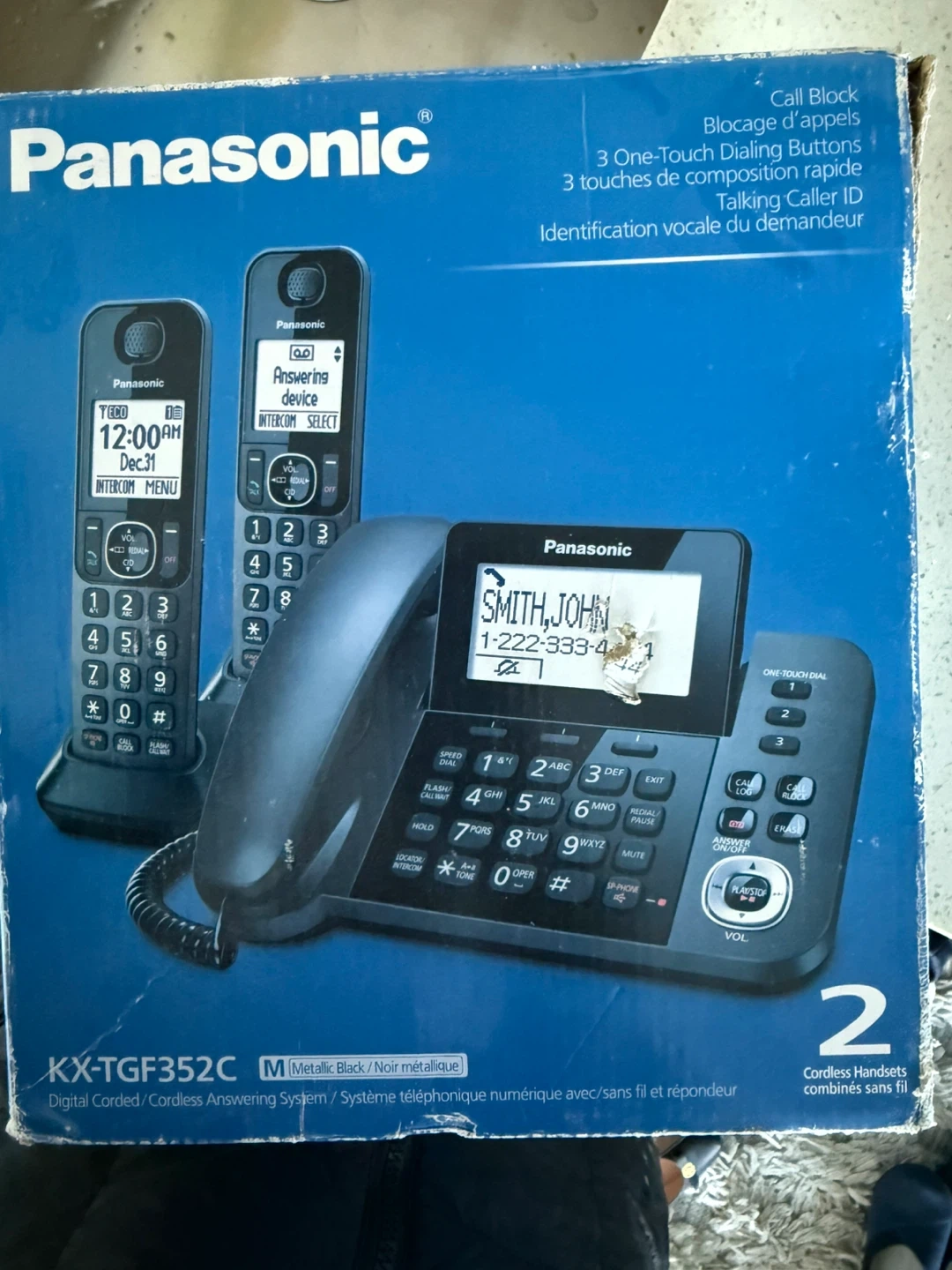Selling a Panasonic KX-TGF352C Digital Cordless Answering System in metallic black. It comes with two cordless handsets and features call block and talking caller ID. The box is included!