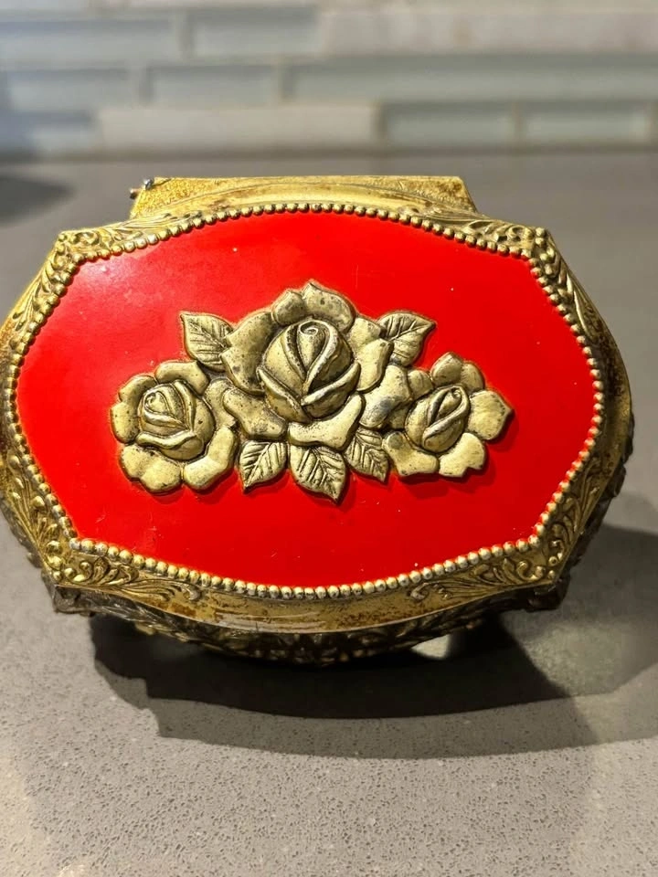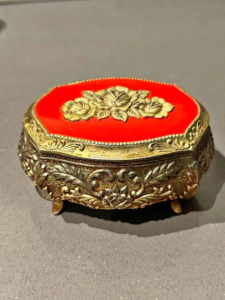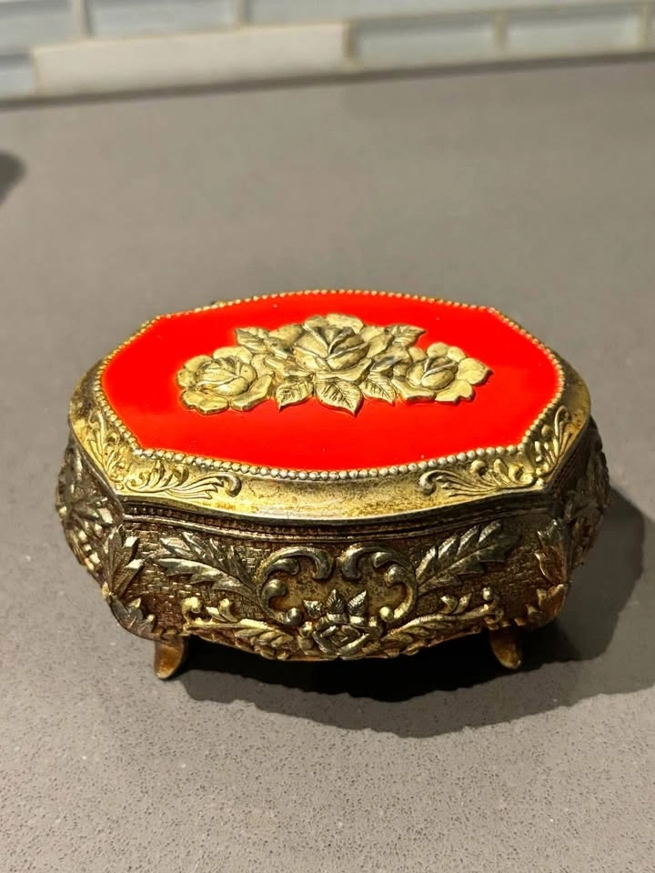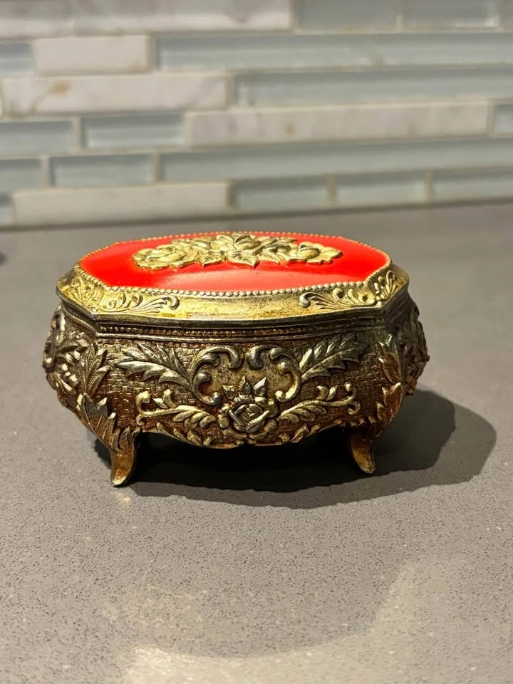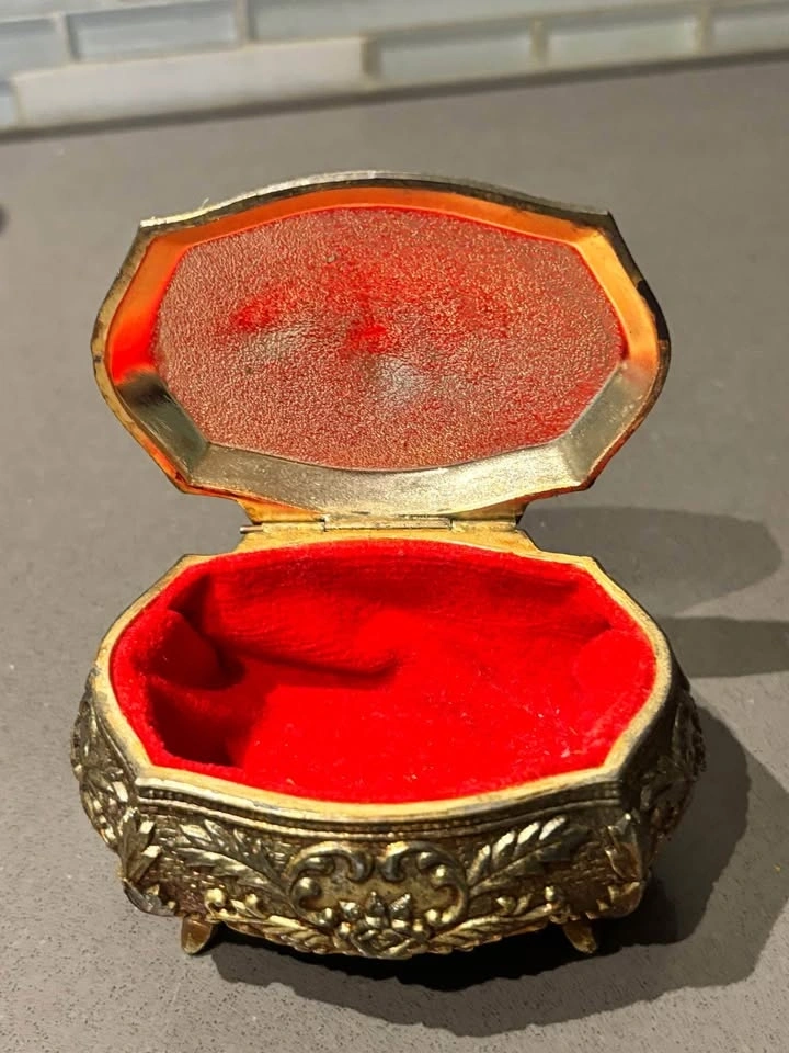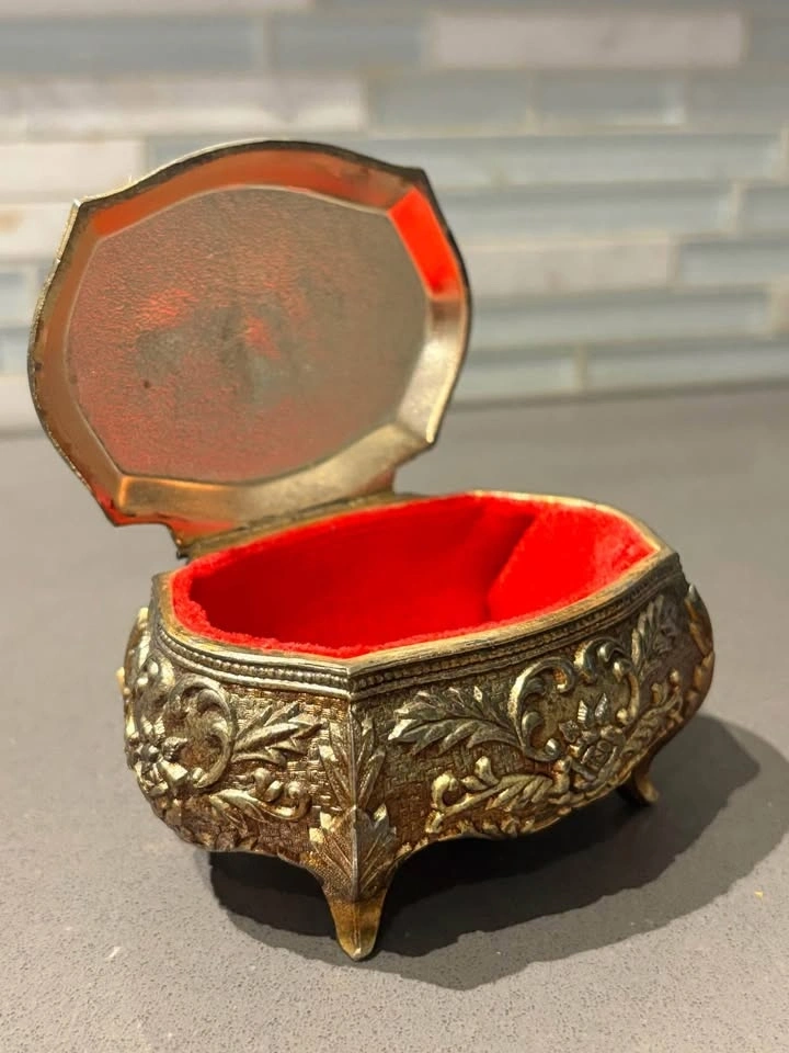 Vintage pewter jewelry box. Interior red velvet. Victorian keepsake box. Inside is lined in a red velvet fabric and the outside has ornate metal feet.