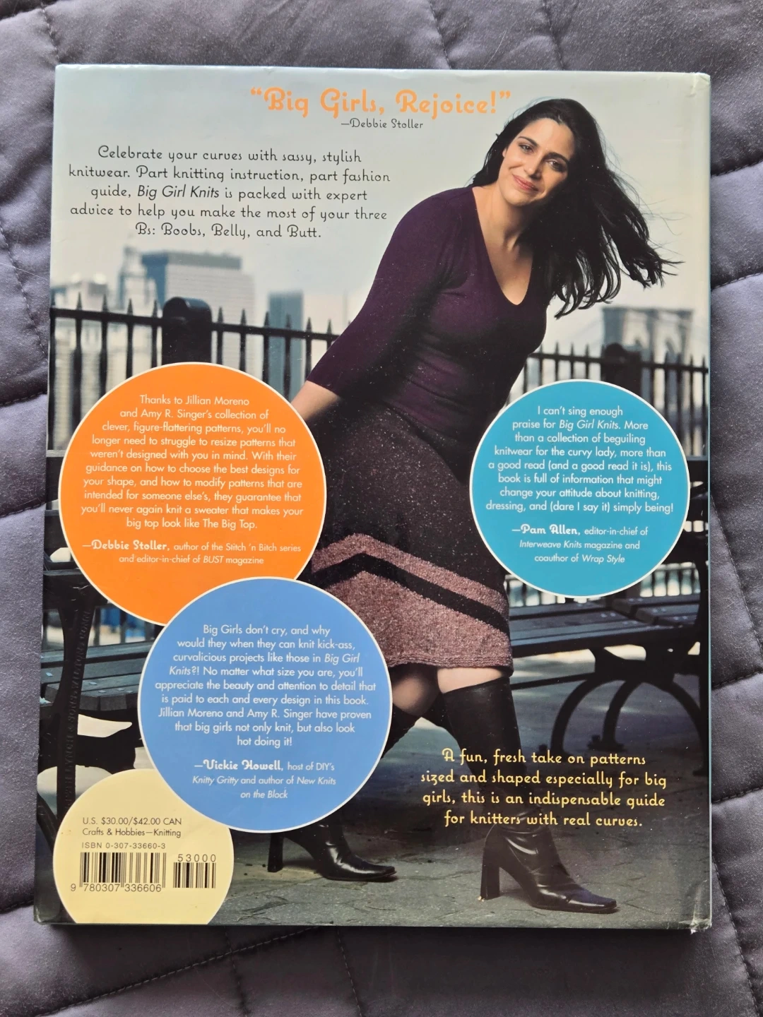 This First Edition hardcover copy of "Big Girl Knits" by Jillian Moreno and Amy R. Singer is a groundbreaking resource for knitters looking to create stylish, well-fitting garments for curvy figures. Released in 2006, this book was among the first to move beyond simple "plus-size" patterns, focusing instead on proportion, silhouette, and flattering design specifically for "real women with real curves".
