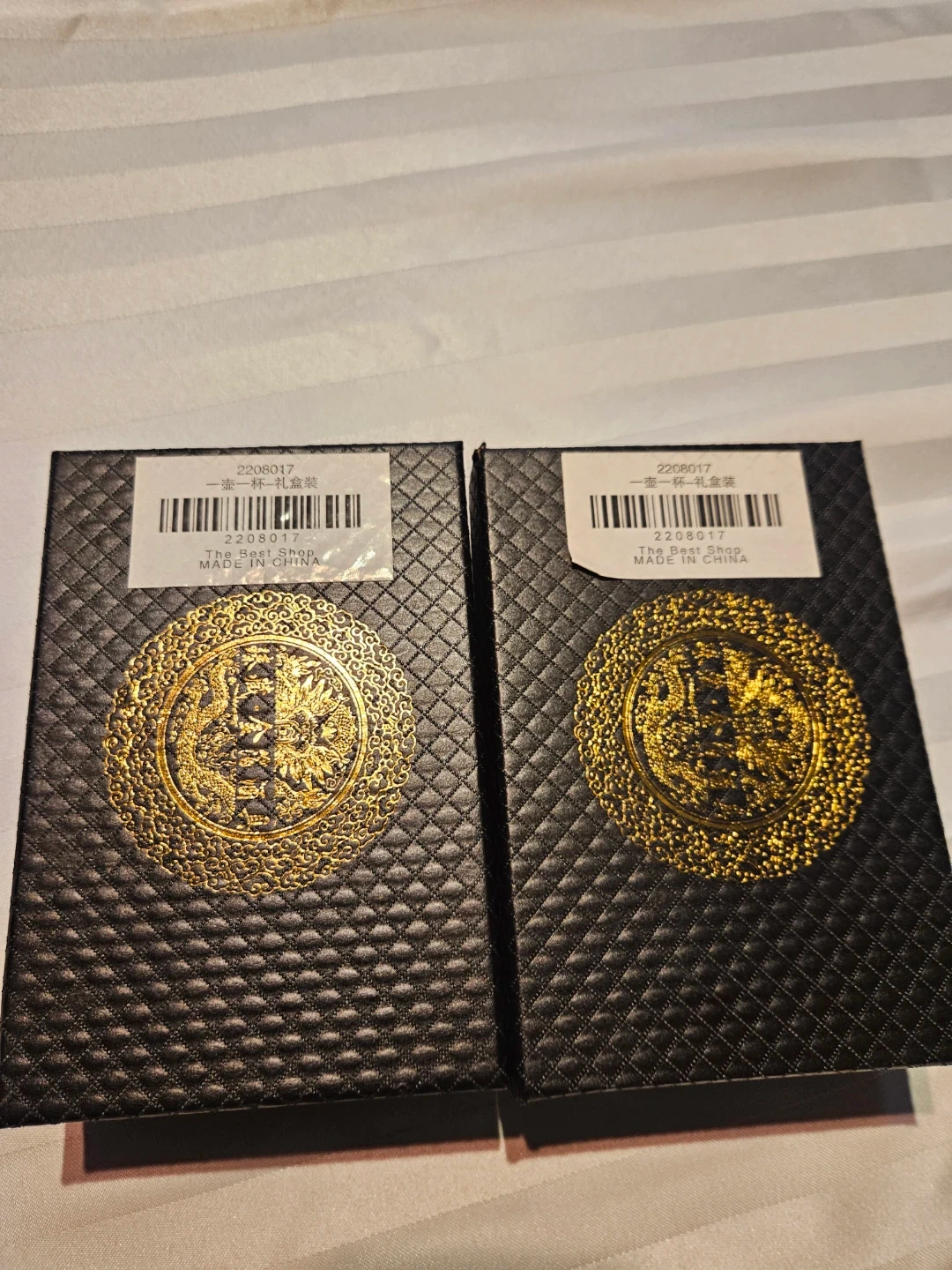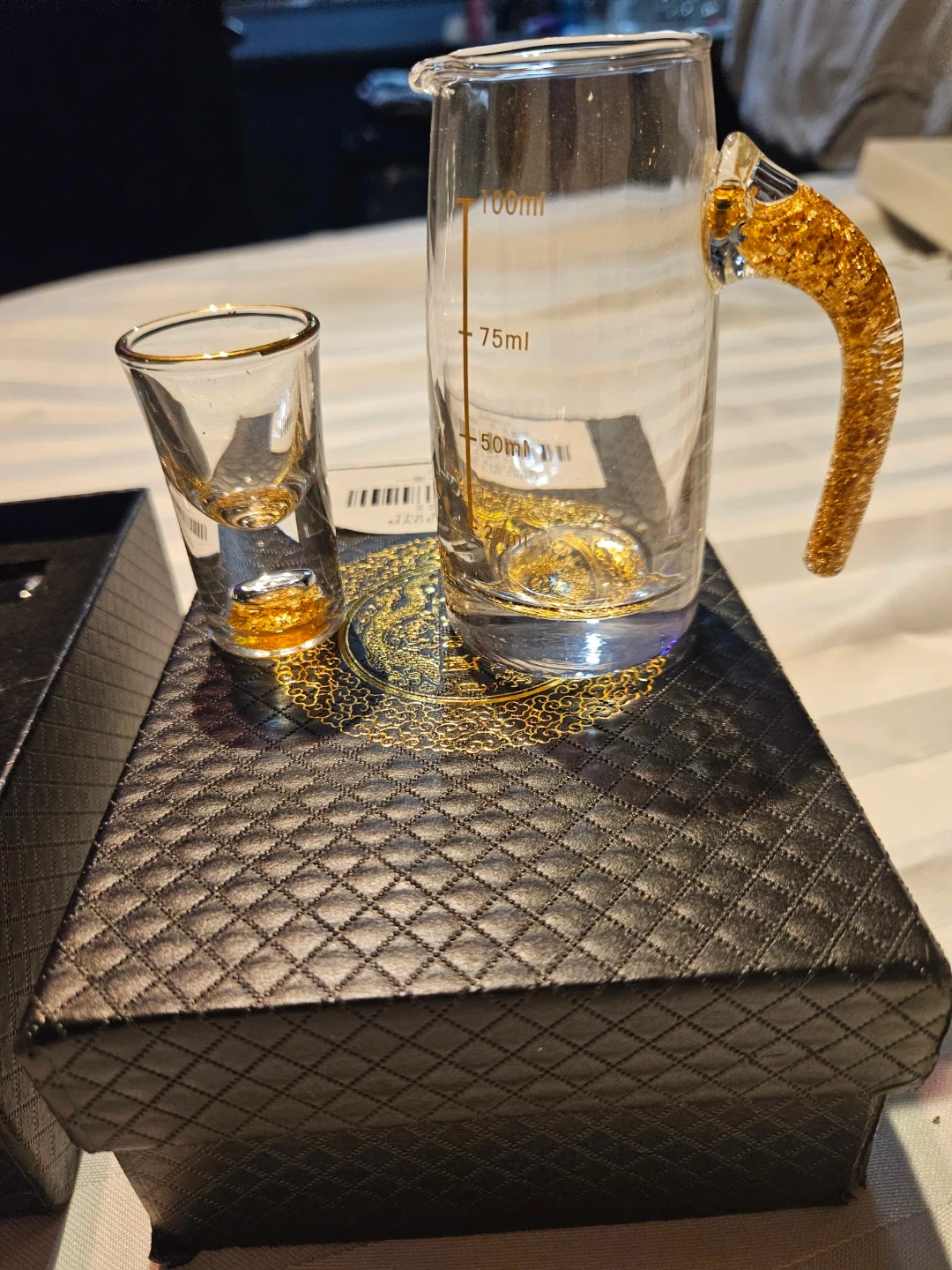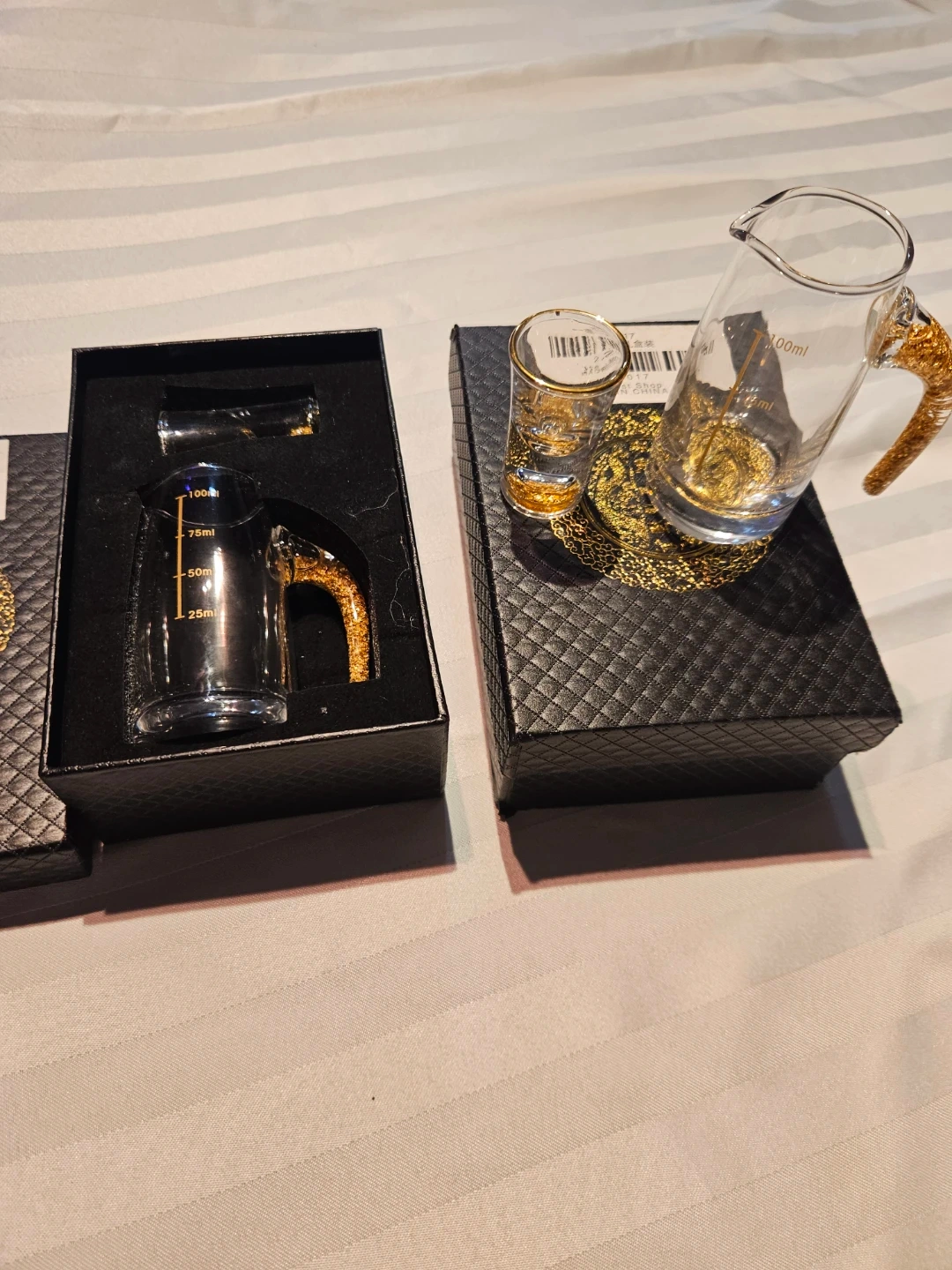 This set includes a glass measuring cup with gold decorative handle and markings up to 100ml. Also included is a matching shot glass. It's presented in a decorative gift box.