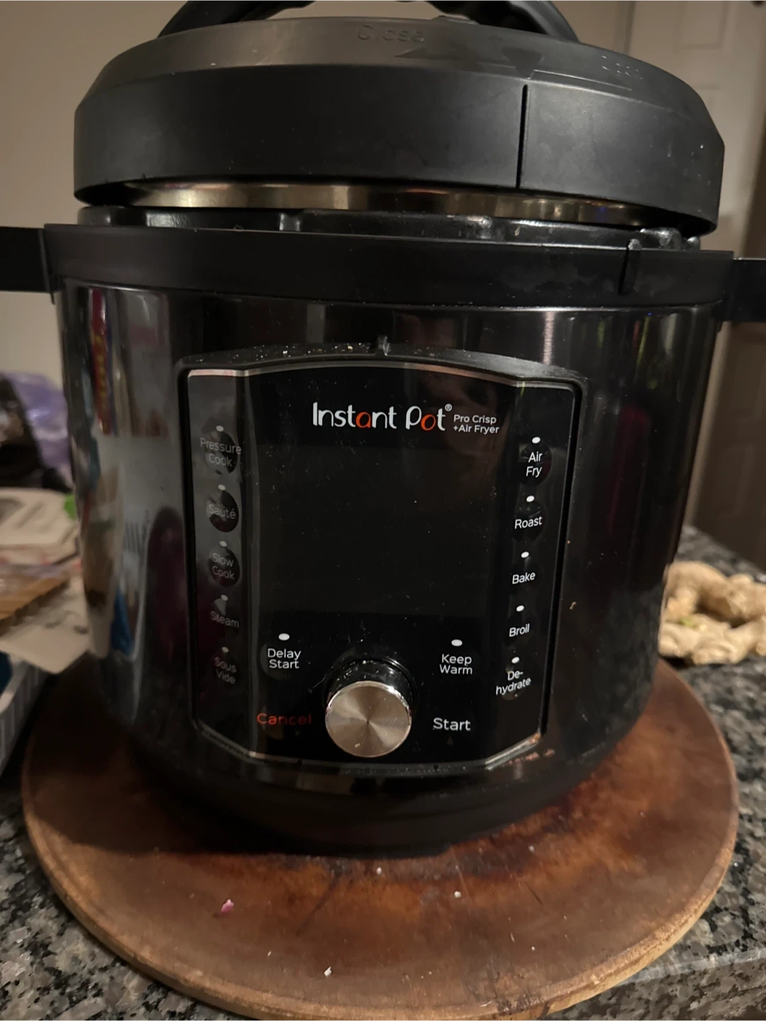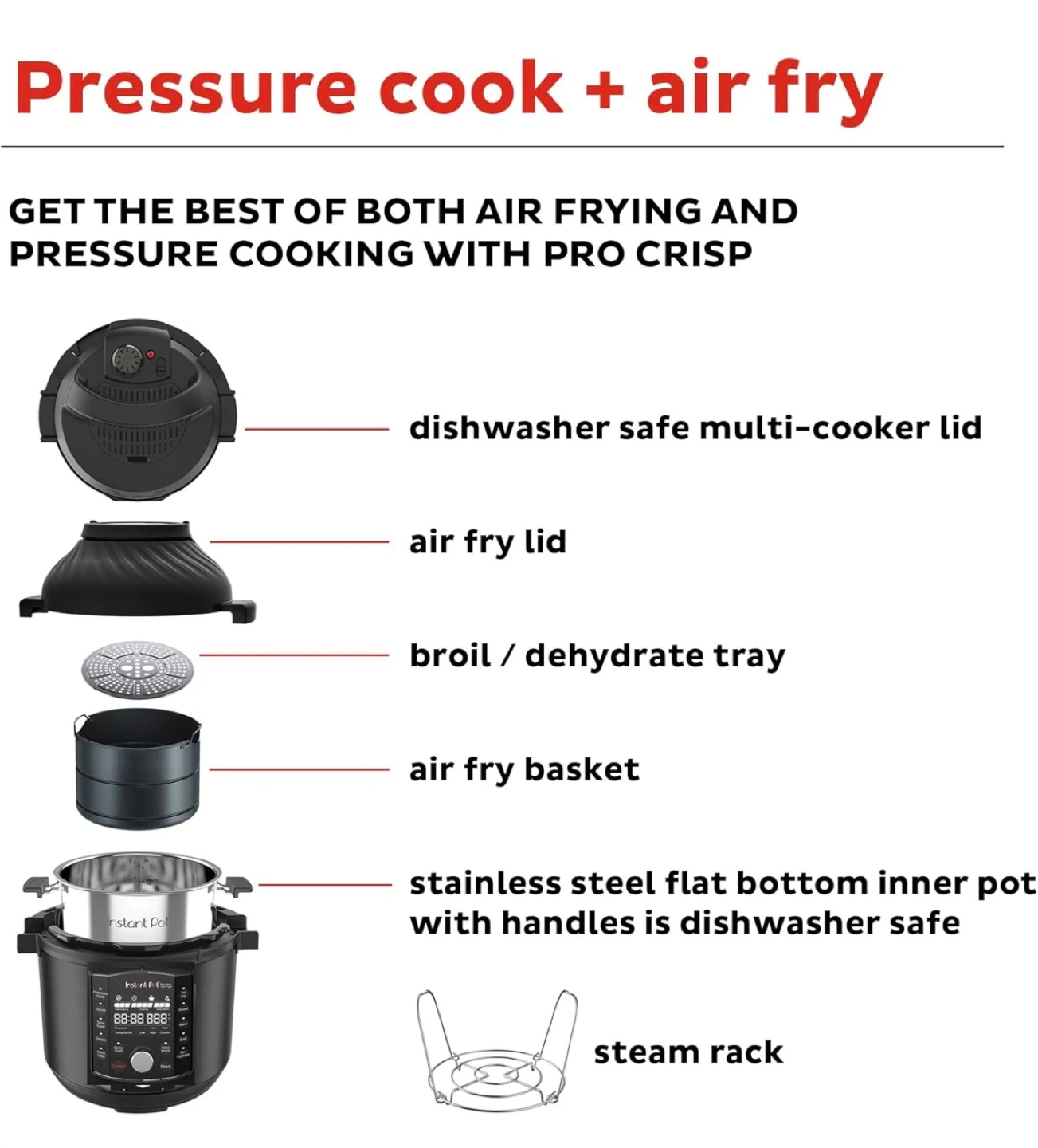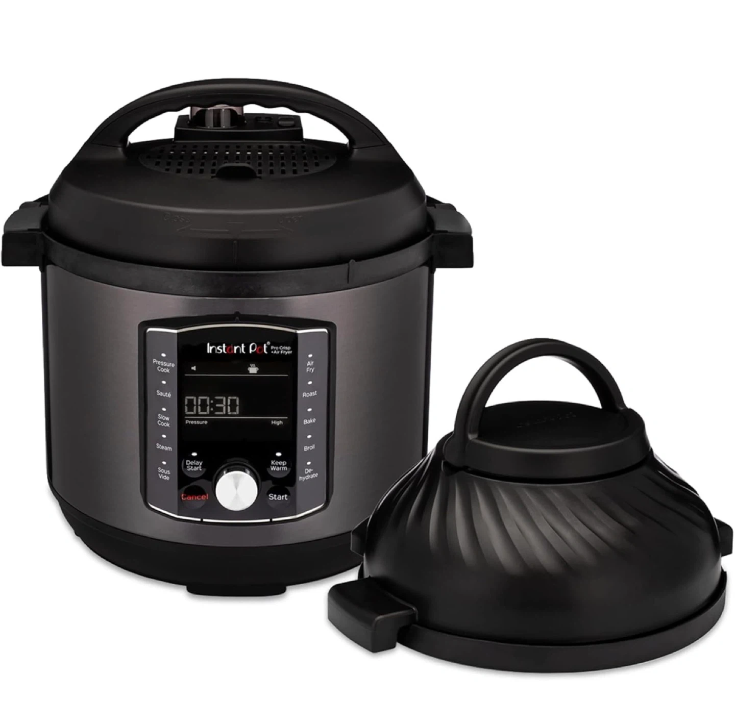 - Two lids: Pressure + Air Fry. 11‑in‑1: pressure cook, sauté, slow cook, sous vide, steam, warm, air fry, roast, bake, broil, dehydrate.