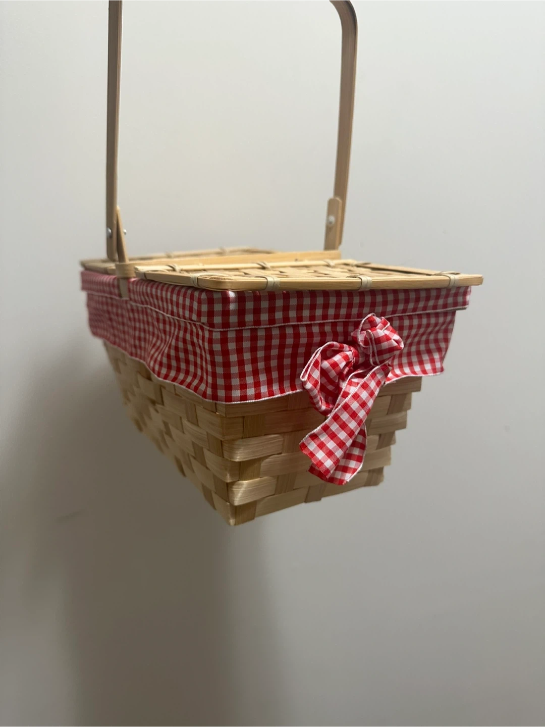 A charming picnic basket featuring a red and white gingham liner and bow accent. It's made of natural woven material with a sturdy wooden handle. This basket is perfect for outdoor gatherings or as a decorative storage item!