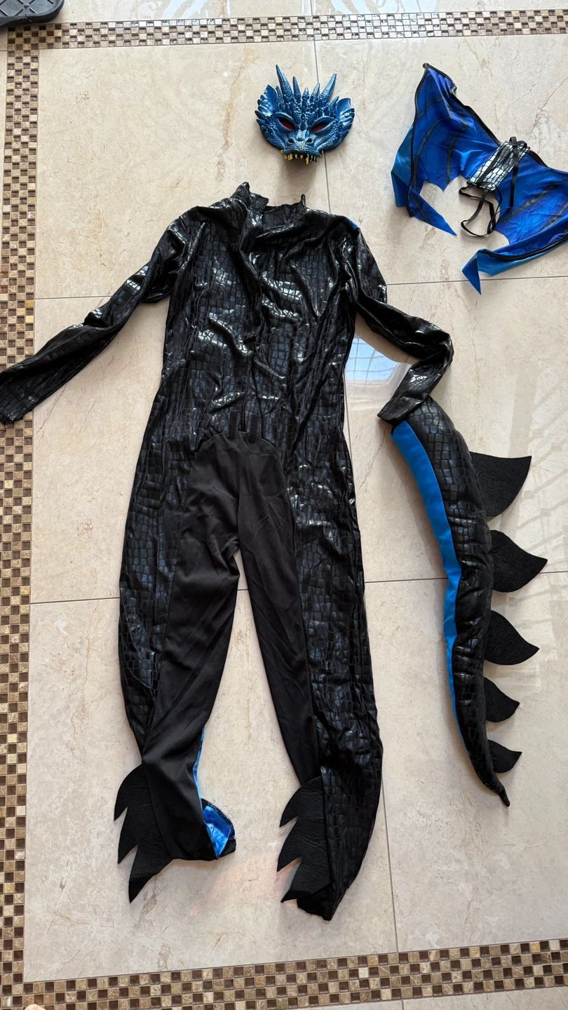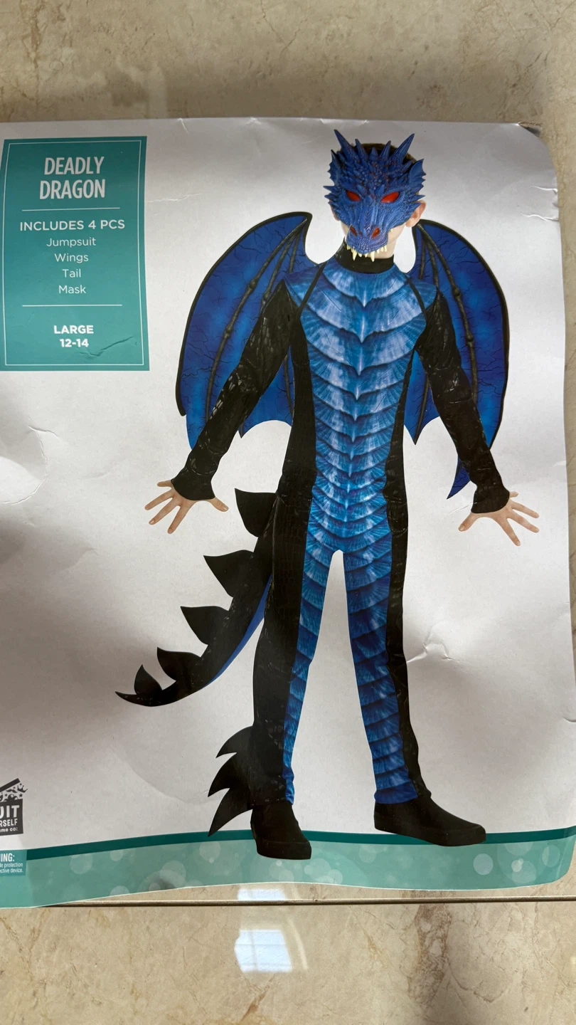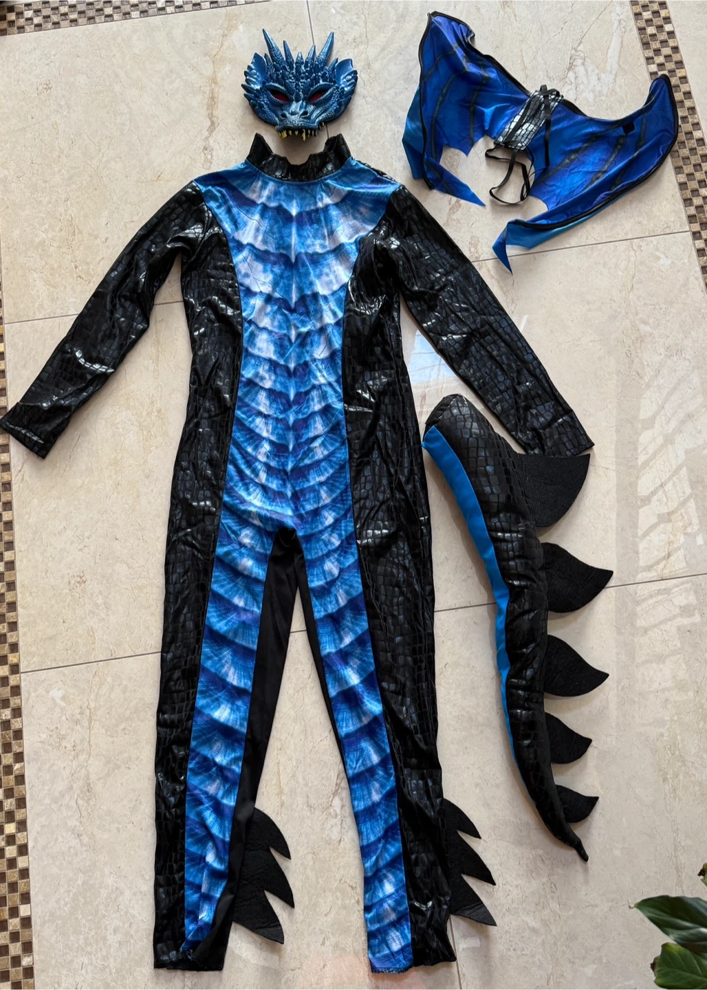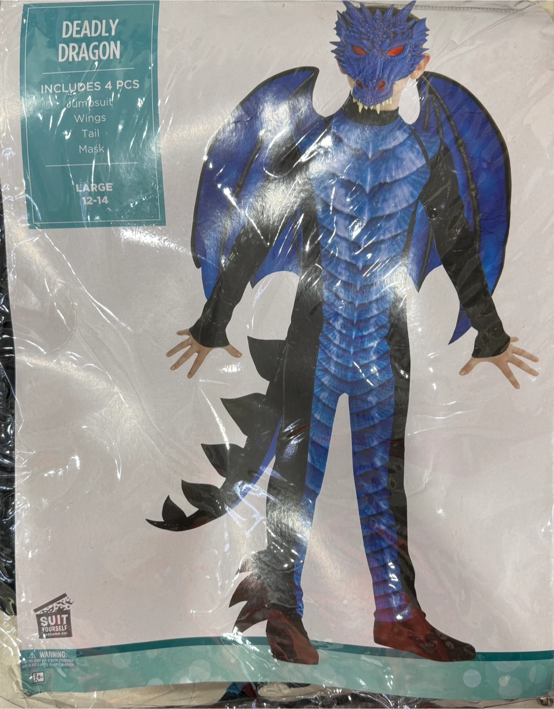 18Selling a Deadly Dragon costume, perfect for Halloween or dress-up! It's a size 12-14 and includes 4 pieces: a jumpsuit, wings, tail, and mask. The costume is in great condition and ready for a new adventure