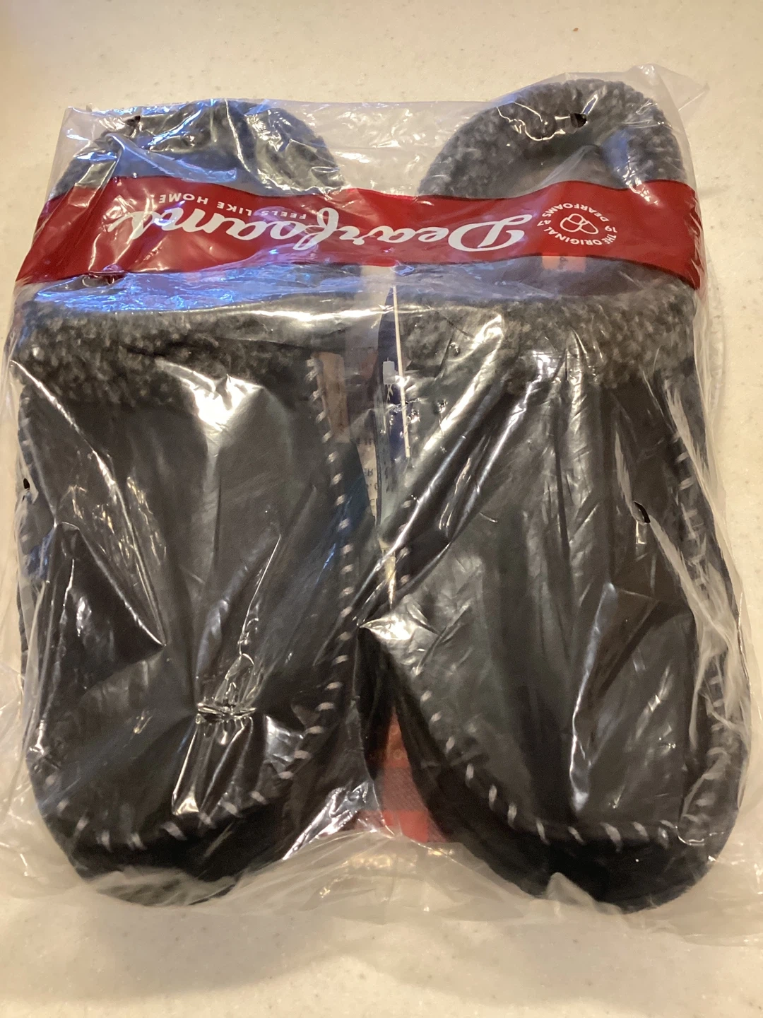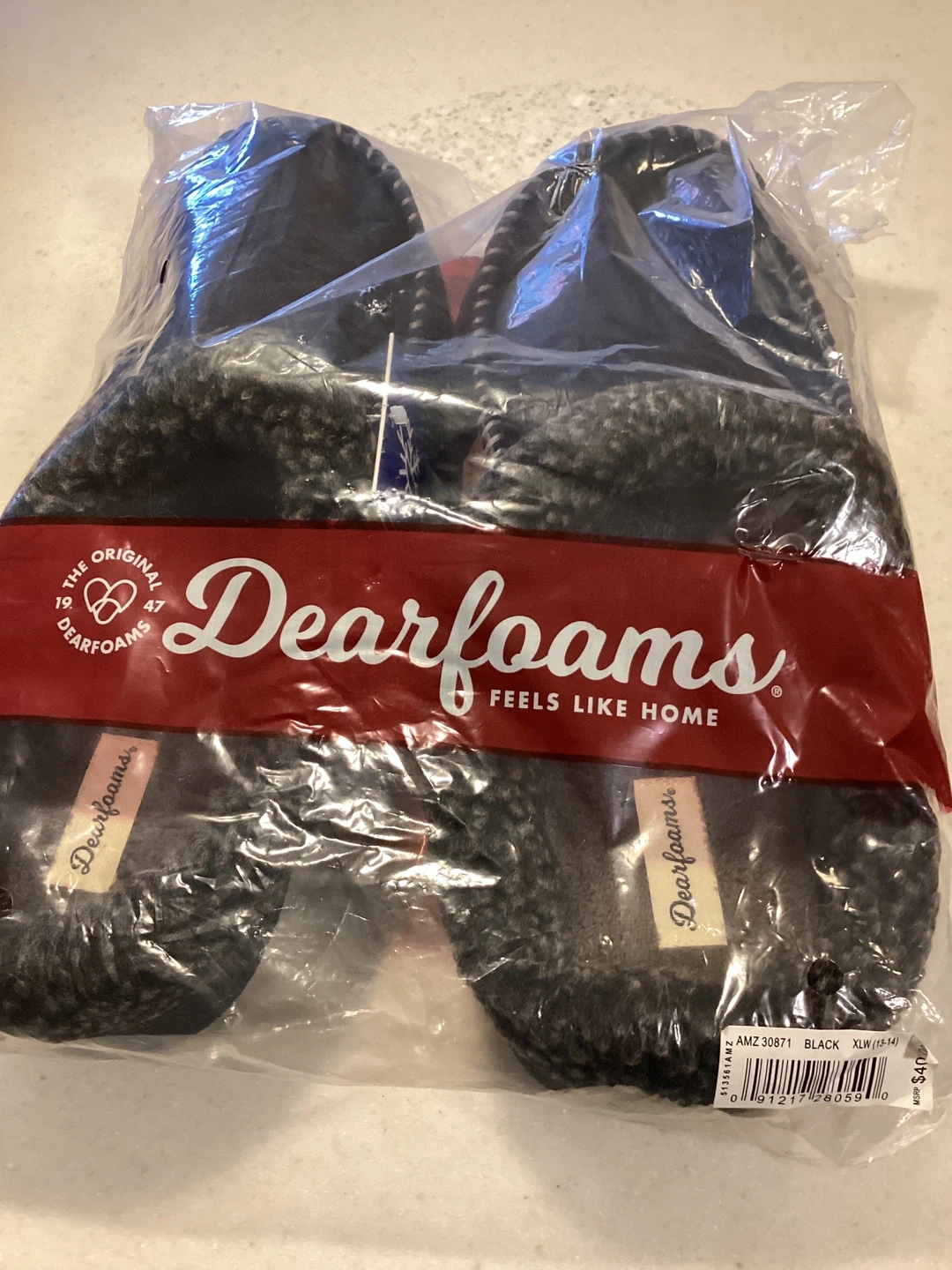 10Selling a brand new pair of Dearfoams slippers! They are black and an XLarge size, fitting sizes 13-14. These feel like home and are easy to slip on and off. Originally priced at $40