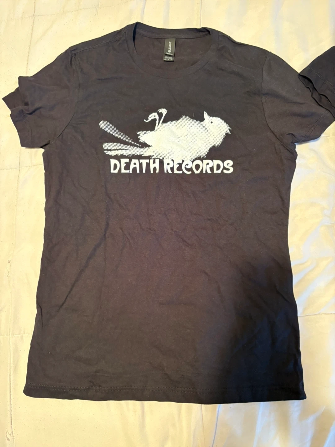 70Selling 2 Death Records graphic t-shirt in size Ladies XL and Men’s L both new and black.