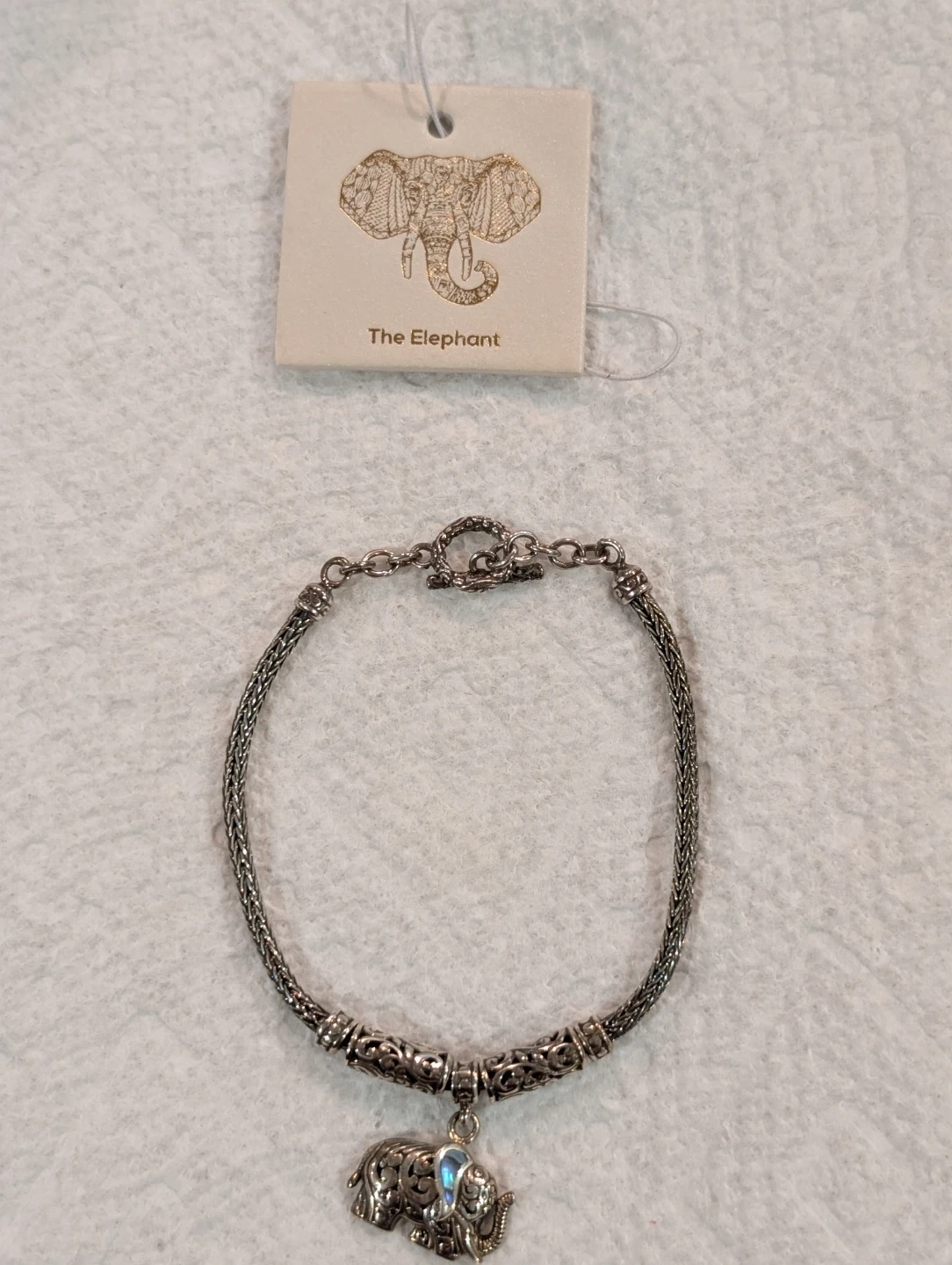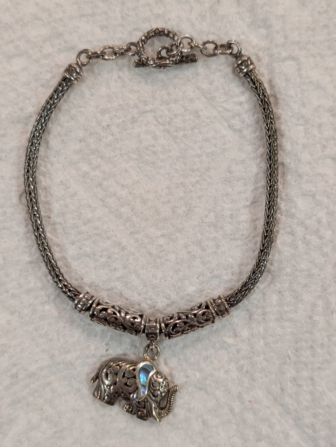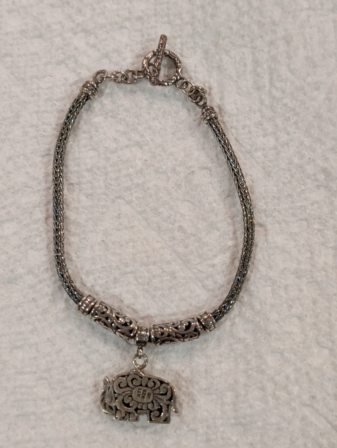 This is a sterling silver bracelet with an elephant charm. The elephant charm has an intricate design. The bracelet has a toggle closure and is marked "925". The charm is also marked "925". This gorgeous bracelet has Byzantine design on either side of the elephant charm, and the rest of the bracelet is wheat chain. Weight is 10.60 grams.
