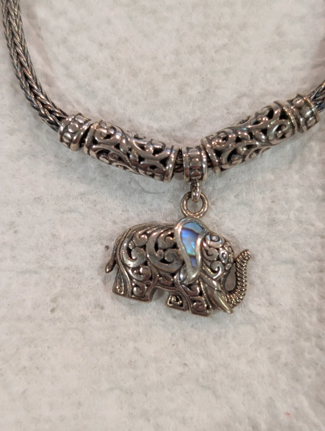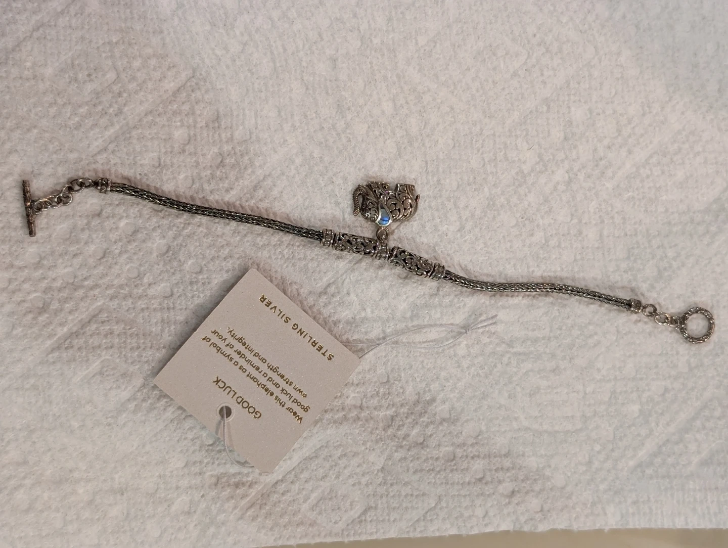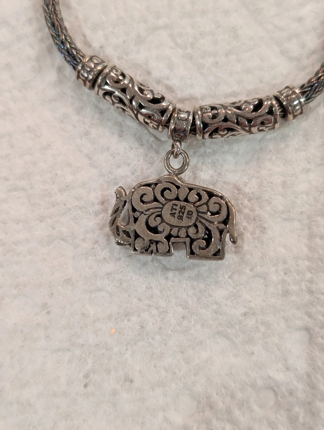 This is a sterling silver bracelet with an elephant charm. The elephant charm has an intricate design. The bracelet has a toggle closure and is marked "925". The charm is also marked "925". This gorgeous bracelet has Byzantine design on either side of the elephant charm, and the rest of the bracelet is wheat chain. Weight is 10.60 grams.