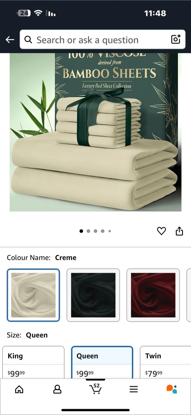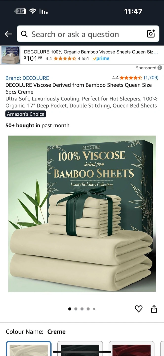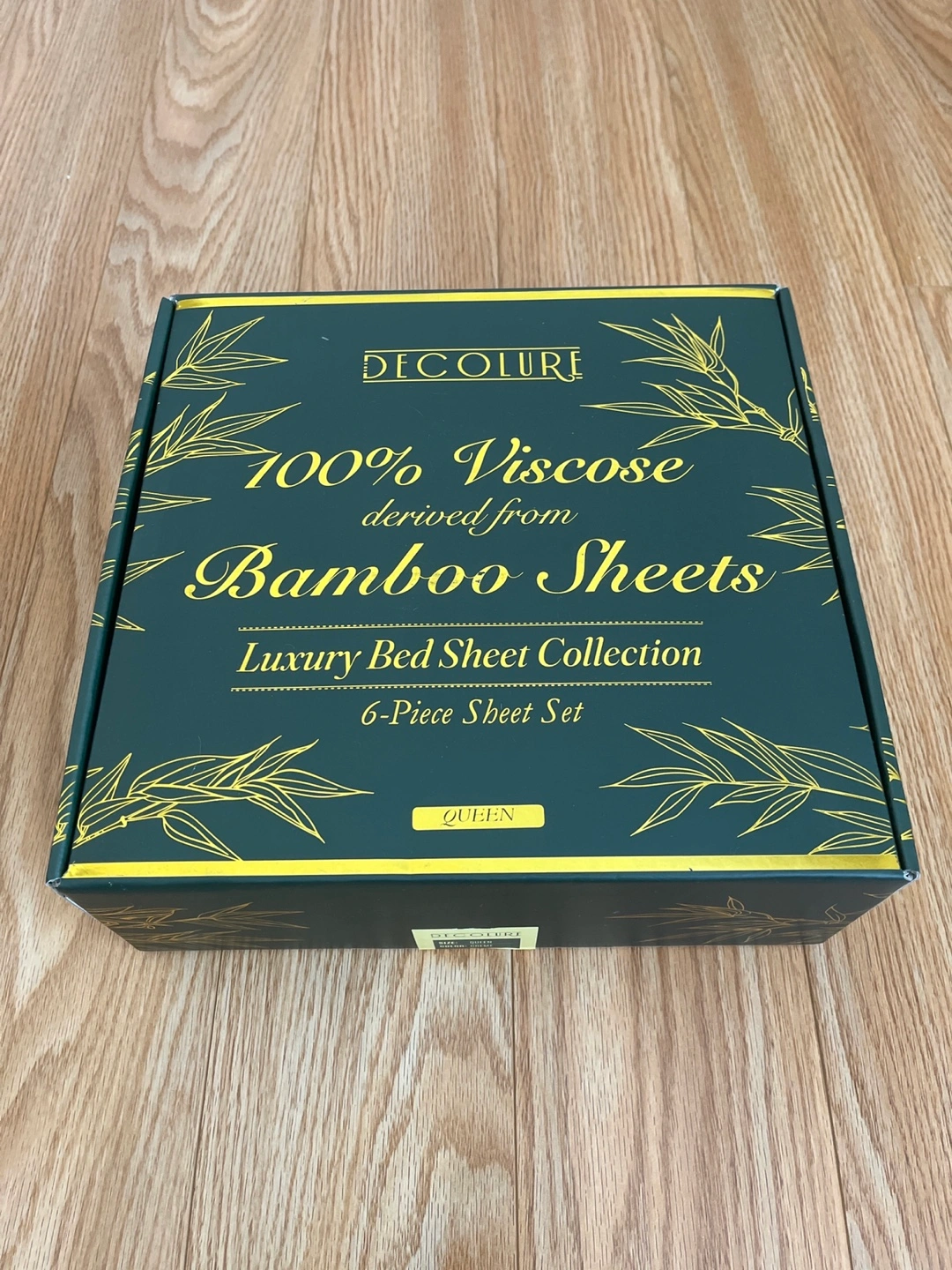 These DECOLURE Queen size bed sheets are made from 100% Viscose derived from Bamboo. They're a lovely creme colour and come in a 6-piece sheet set. The sheets are ultra soft, luxuriously cooling, and perfect for hot sleepers. They are 100% organic and have 17" deep pockets and double stitching. The box is included!