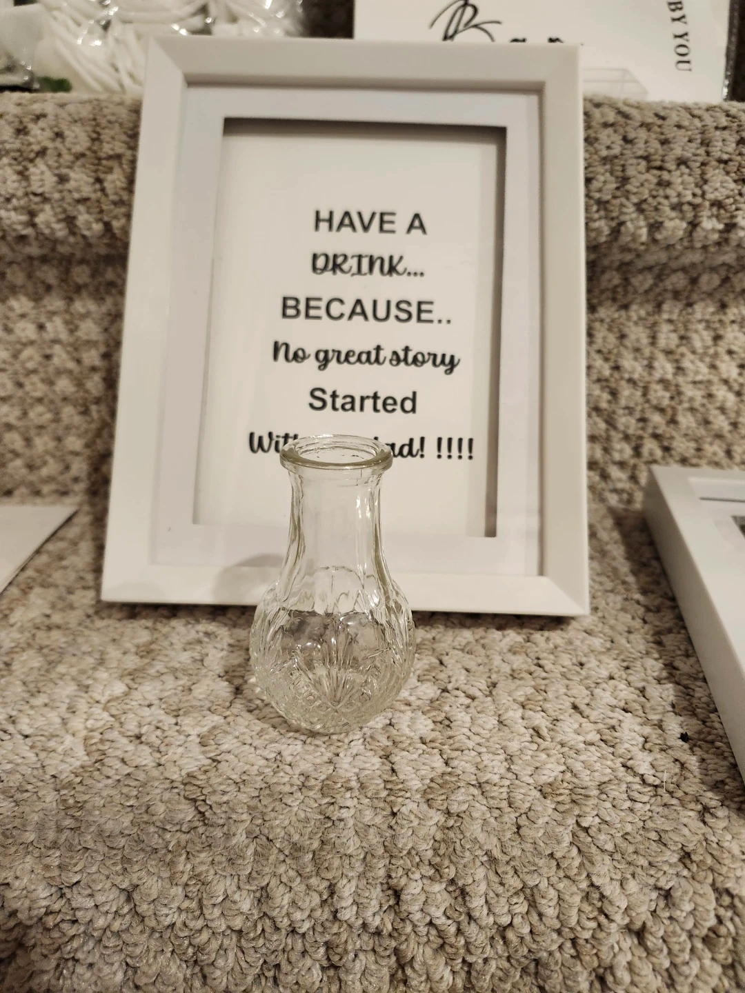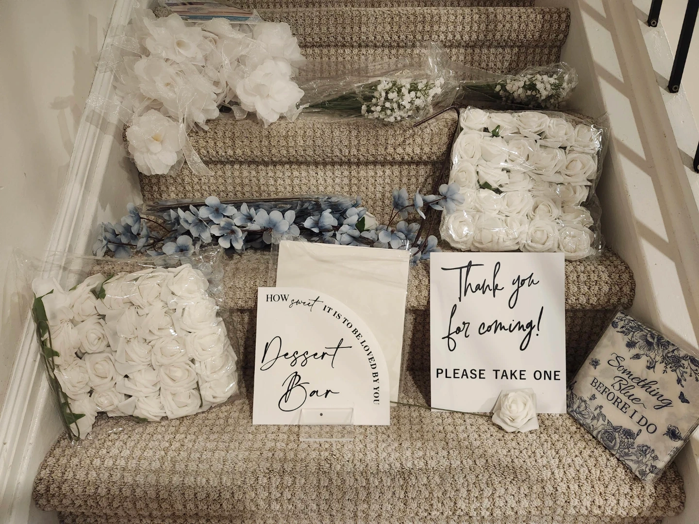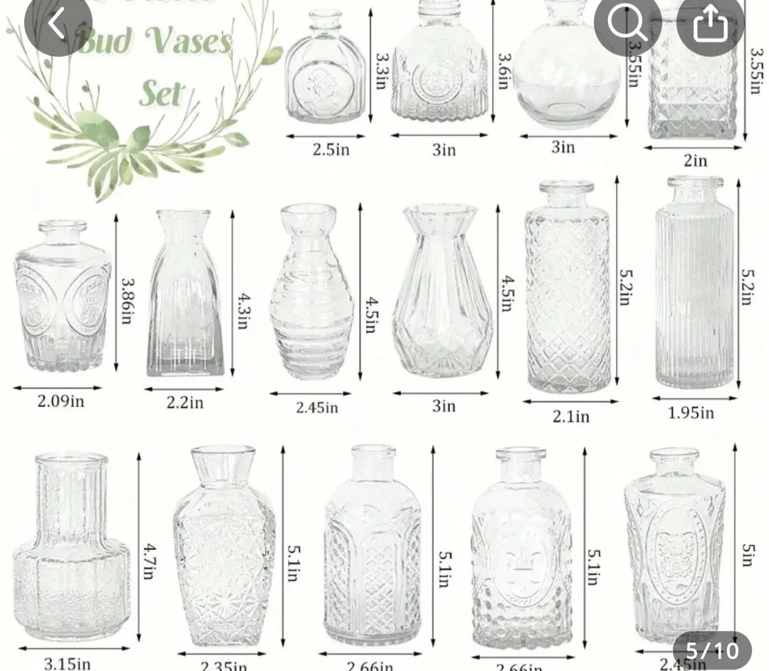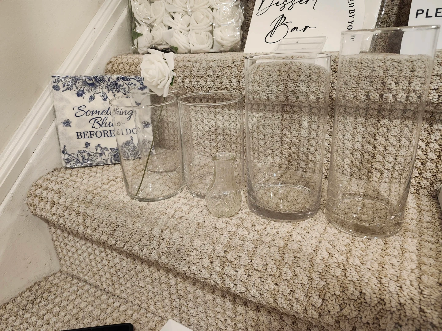 0Selling a set of assorted bud vases! They come in various shapes and sizes, perfect for adding a touch of elegance to any event or decor. The sizes range from approximately 2 inches to 5 inches in height. Also included is a blue table runner that measures 35 inches by 120 inches. 67 of the dusty blue table napkins 9 table dusty blue runner 18 bud vases dusty blue Artificial flowers white roses Filler Dusty blue Artificialb flowers 2 large 5 picture fram 4 x 6 1 3 x5 19 clear bud vases 5 vases 3 small 2 large different size and shape