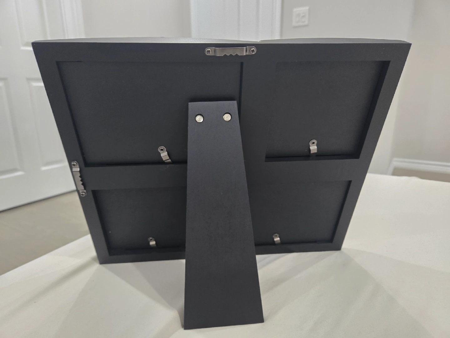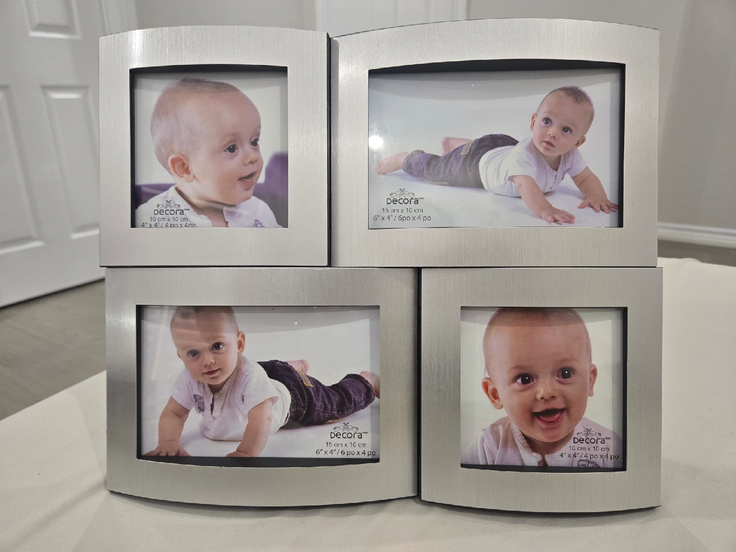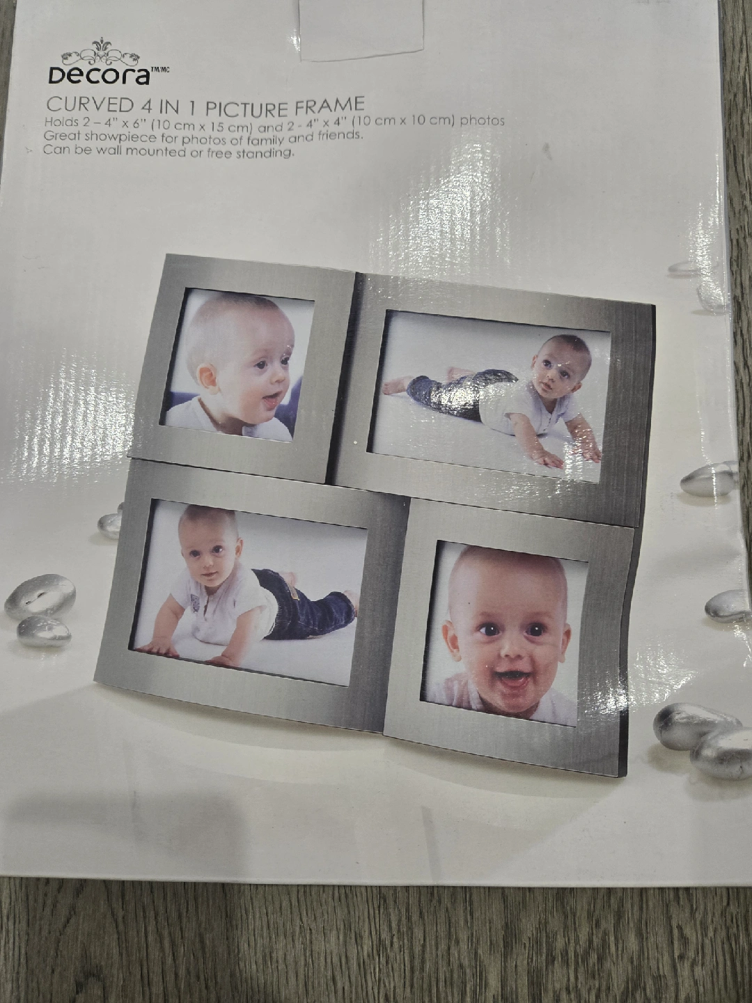 Selling a Decora 4-in-1 picture frame! It's a curved design that holds 2 - 4" x 6" (10 cm x 15 cm) photos and 2 - 4" x 4" (10 cm x 10 cm) photos. Great showpiece for photos of family and friends. It can be wall mounted or free standing. Box is a bit warped but frame is brand new never used.