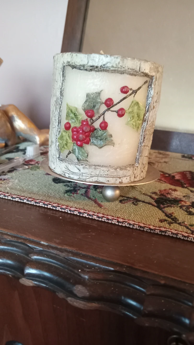 43This is a charming decorative candle, designed to look like birch bark. It has a lovely holly and berry design on one side, perfect for adding a touch of nature to your home decor Size 4 inch high x 12 inches diameter 4 inch wide
