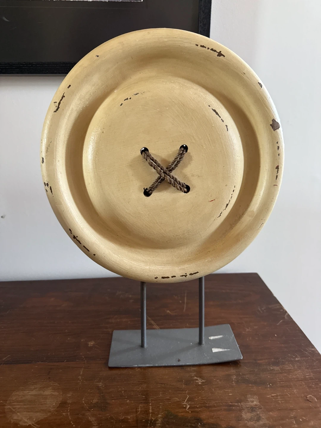 A cute decorative button on a metal stand! It's a unique piece that would look great on a shelf or desk