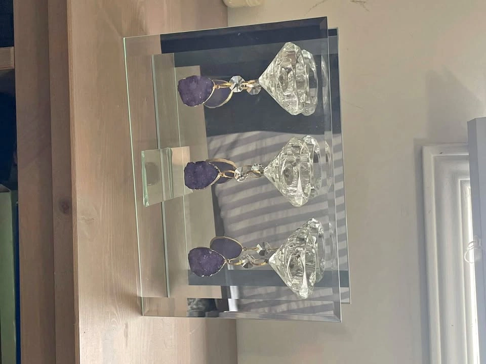 Decorative candle holder with a mirror backdrop. Amythest gems are dangling from the candle holders.