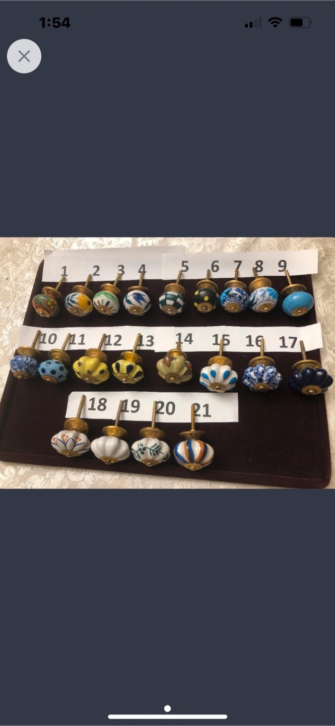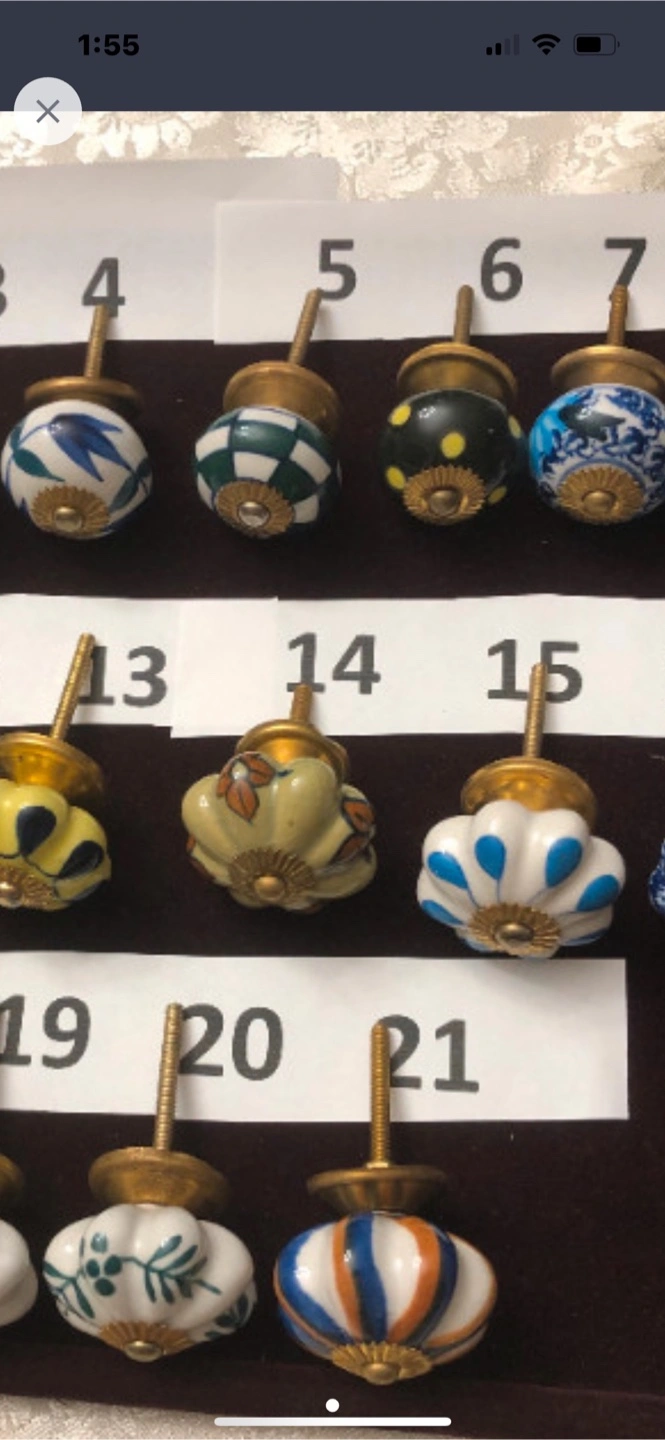 Hand painted decorative ceramic cabinet knobs. They come in a variety of colours and patterns, perfect for adding a unique touch to your furniture or cabinets! More quantity available. $1.00 each knob.