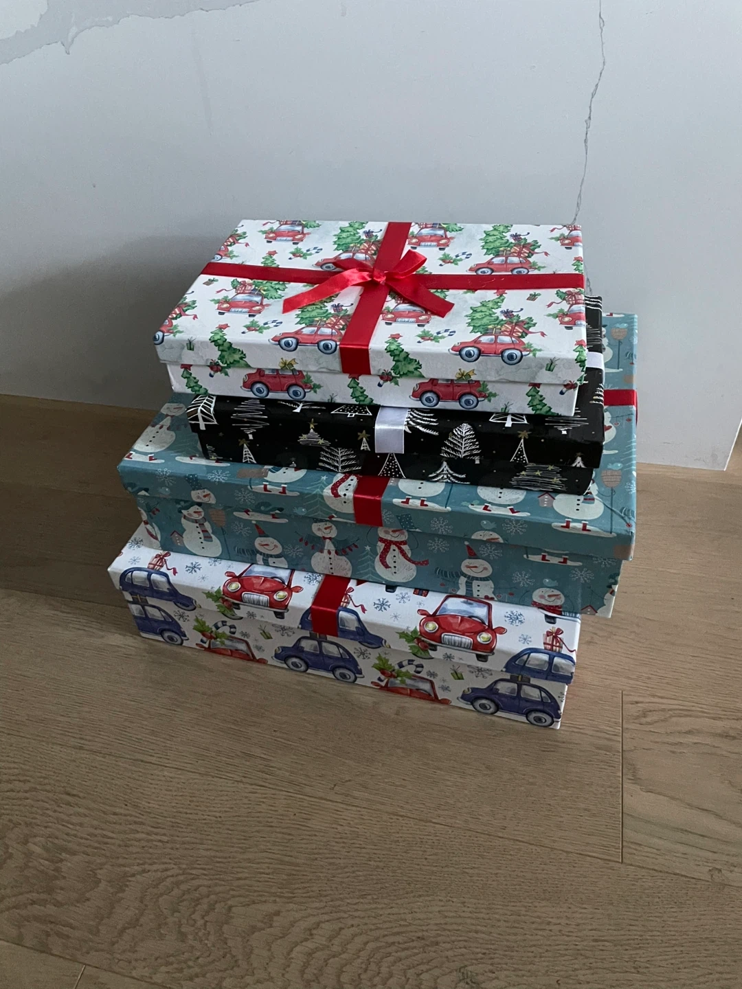 Selling a set of decorative Christmas-themed storage boxes. They feature festive designs with cars, snowmen, and Christmas trees. Perfect for storing holiday decorations or gifts! All for 10$ Cash only