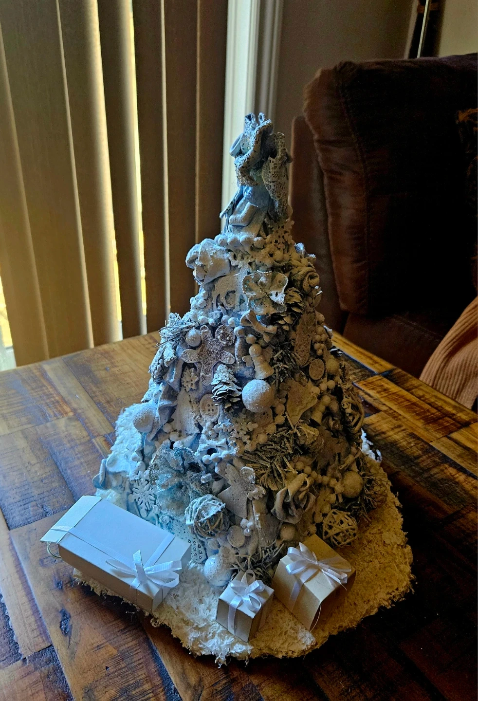 0This is a beautiful decorative Christmas tree, perfect for adding a touch of winter wonderland to your home! It's adorned with various ornaments and comes with decorative presents at the base.
