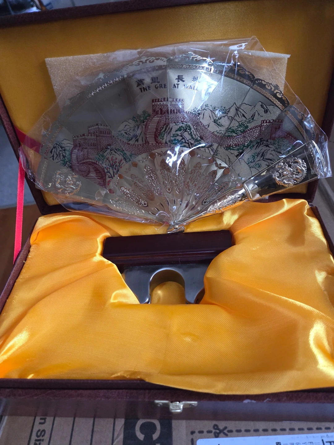 94Beautiful decorative fan featuring a design of the Great Wall. Comes in its original box with a lovely yellow satin lining and base for displaying. The material of the fan is metal. Perfect for display or as a unique gift!