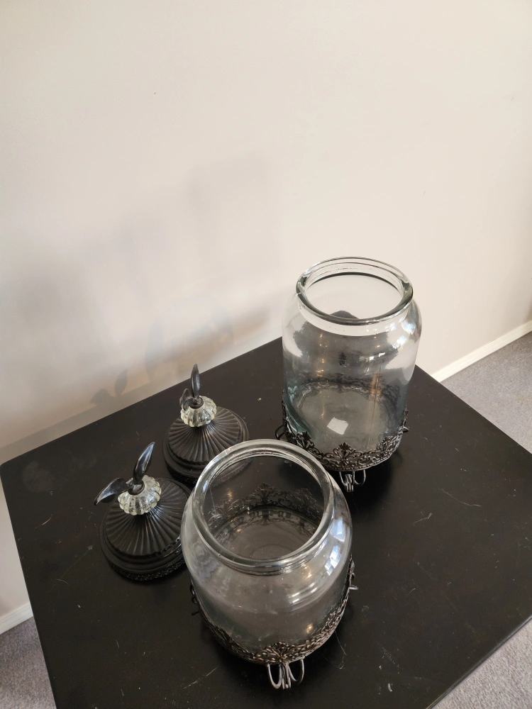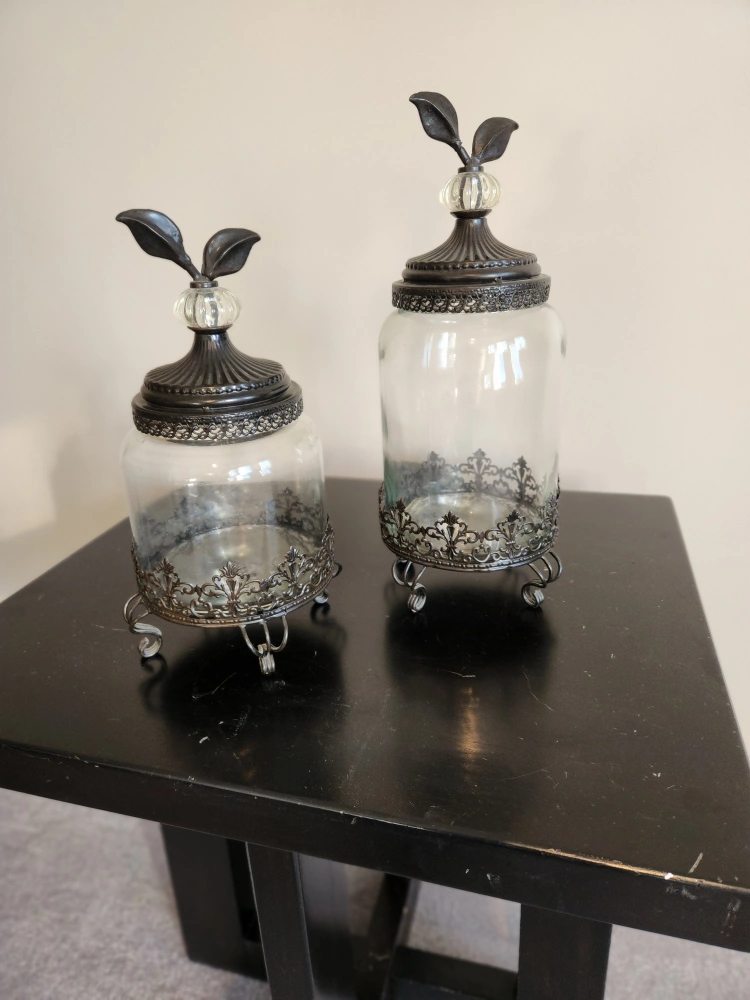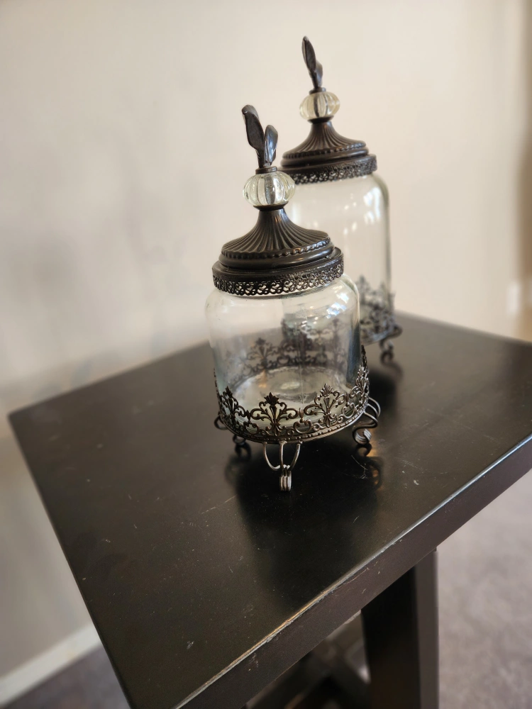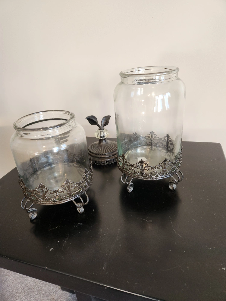 90Selling a set of two decorative glass jars, perfect for adding a touch of elegance to any room! They feature ornate metal stands and lids, adding a unique and stylish touch. They're in great condition and ready to find a new home!