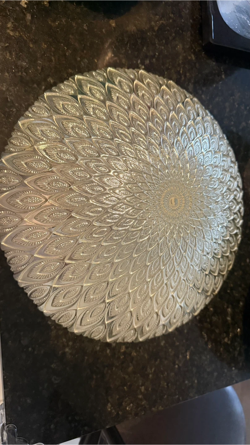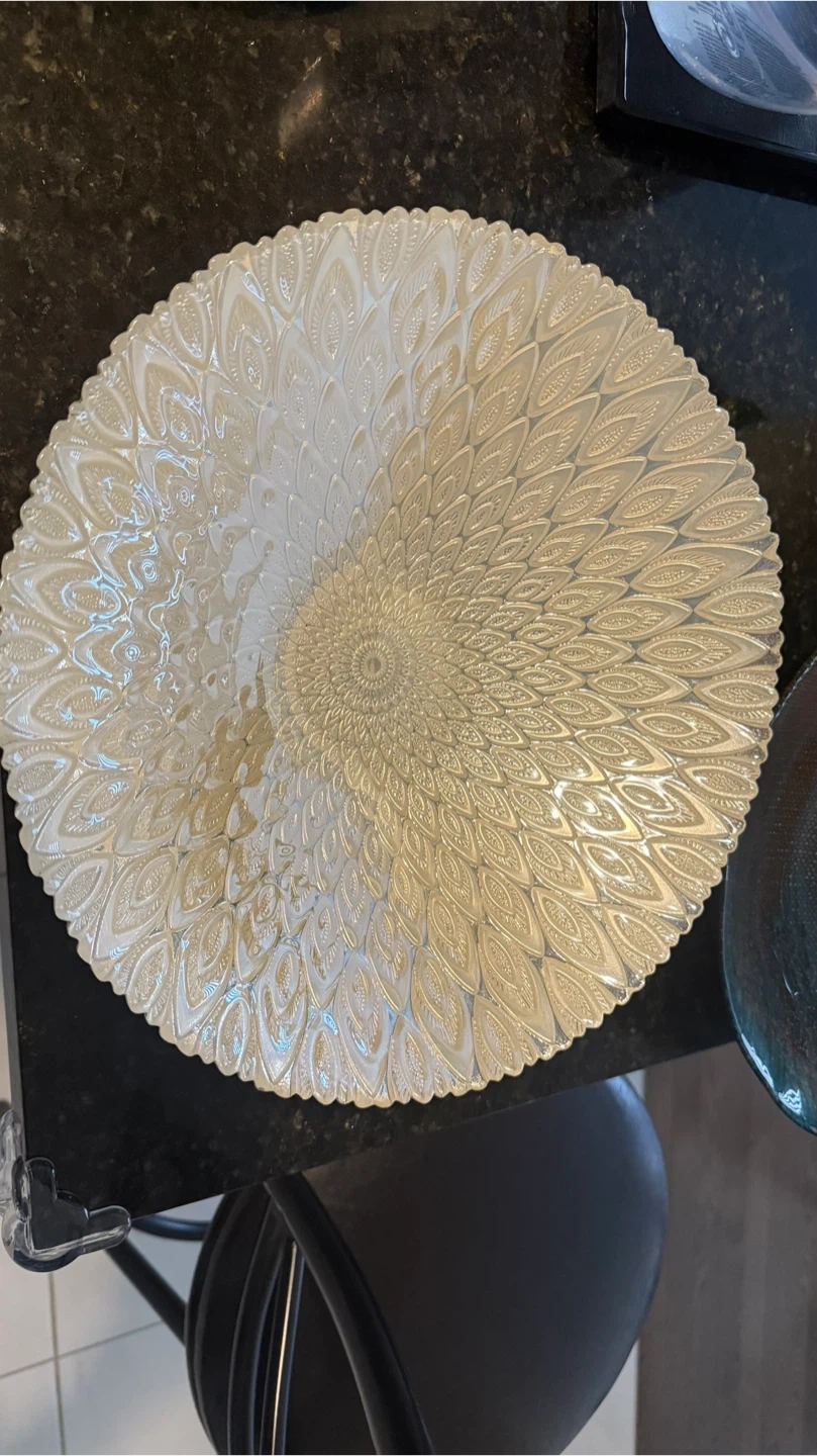 37Selling a decorative glass platter with a beautiful, intricate design. It's perfect for adding a touch of elegance to your table setting or as a decorative piece in your home. It's in great condition and ready for a new home!