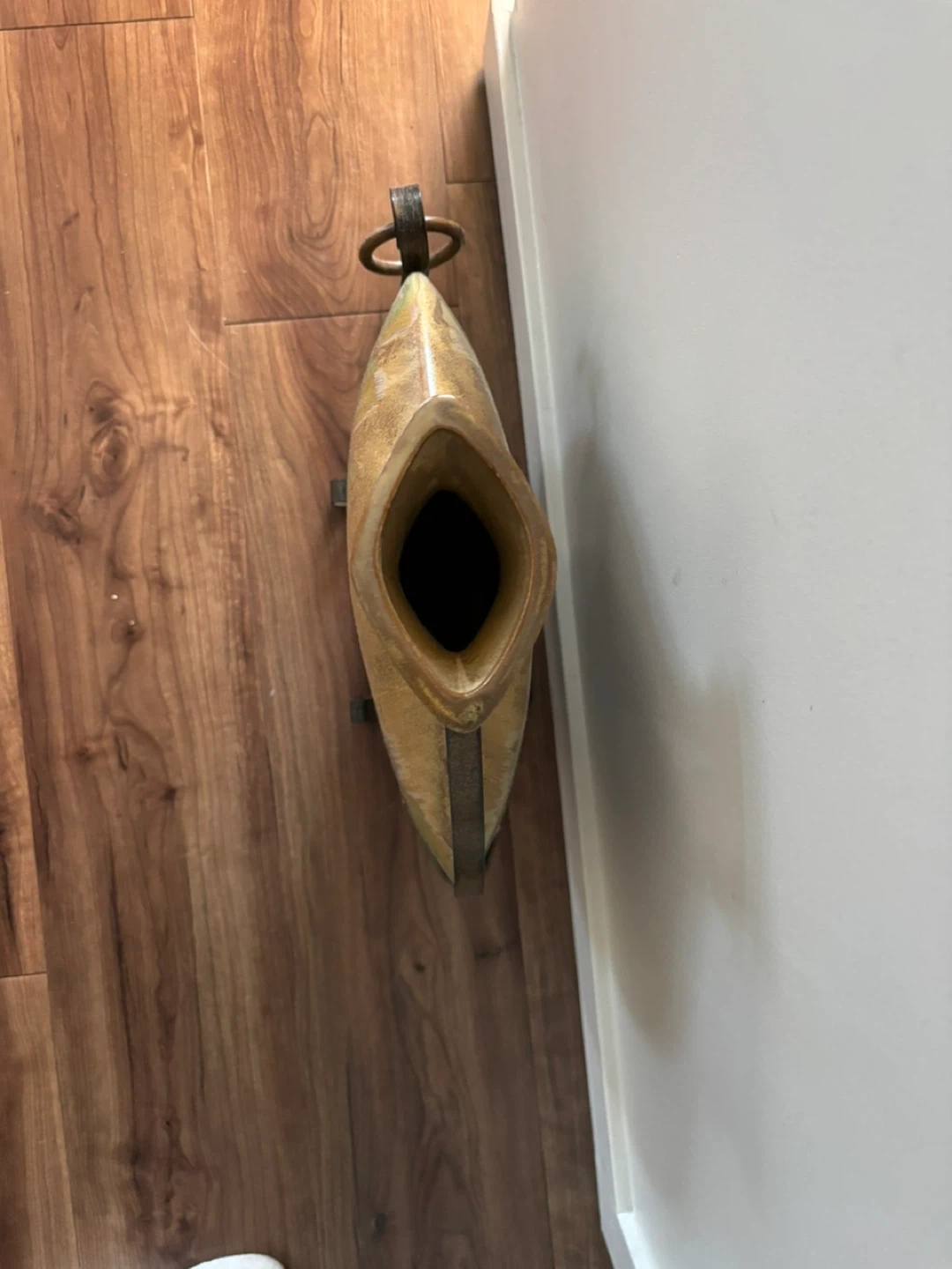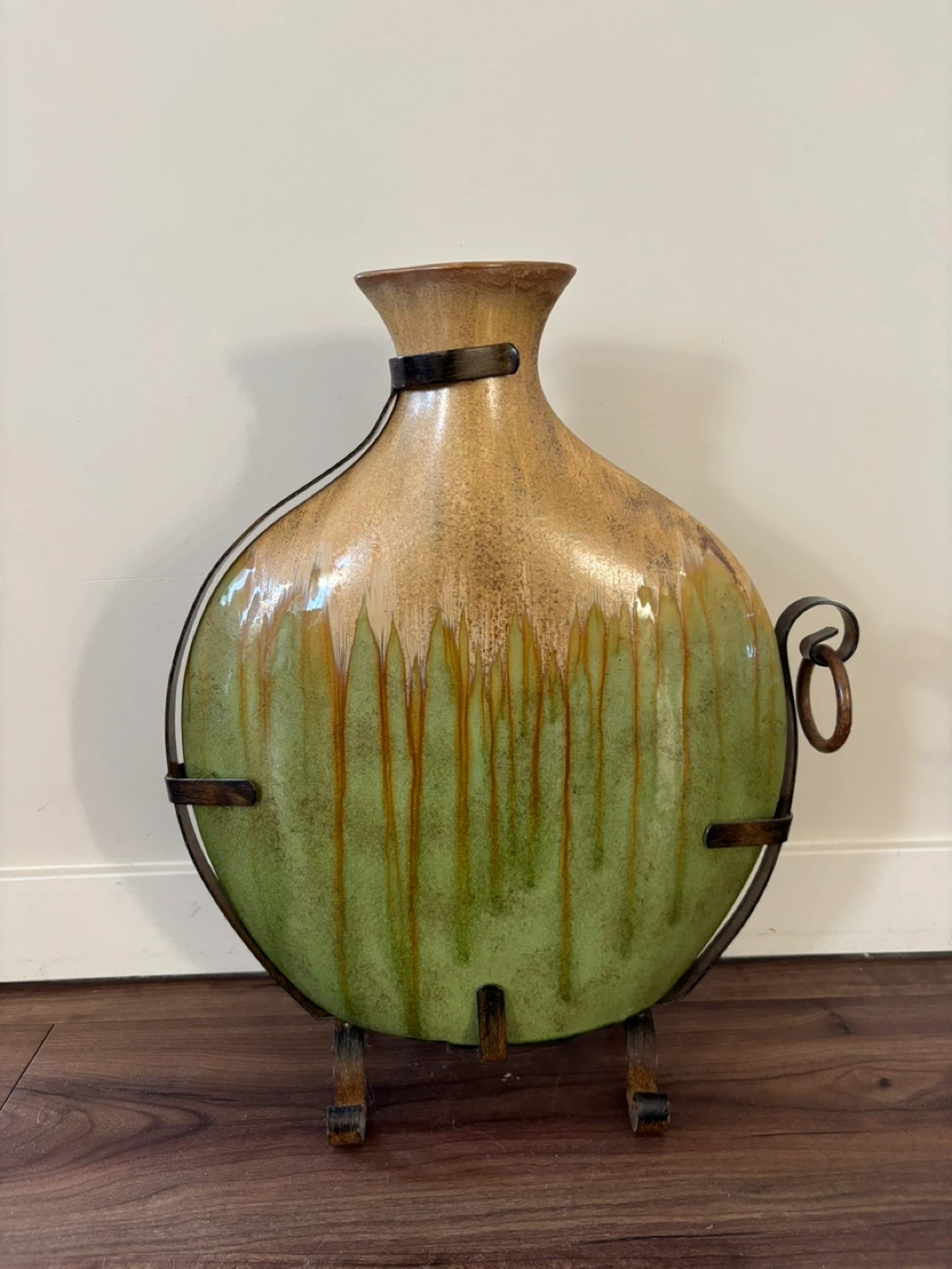Add a unique touch to your home decor with this eye-catching vase! It features a blend of green and brown hues with a distinctive drip design. The vase comes with a sturdy metal stand that complements its overall aesthetic. It's perfect for displaying flowers or simply as a standalone art piece