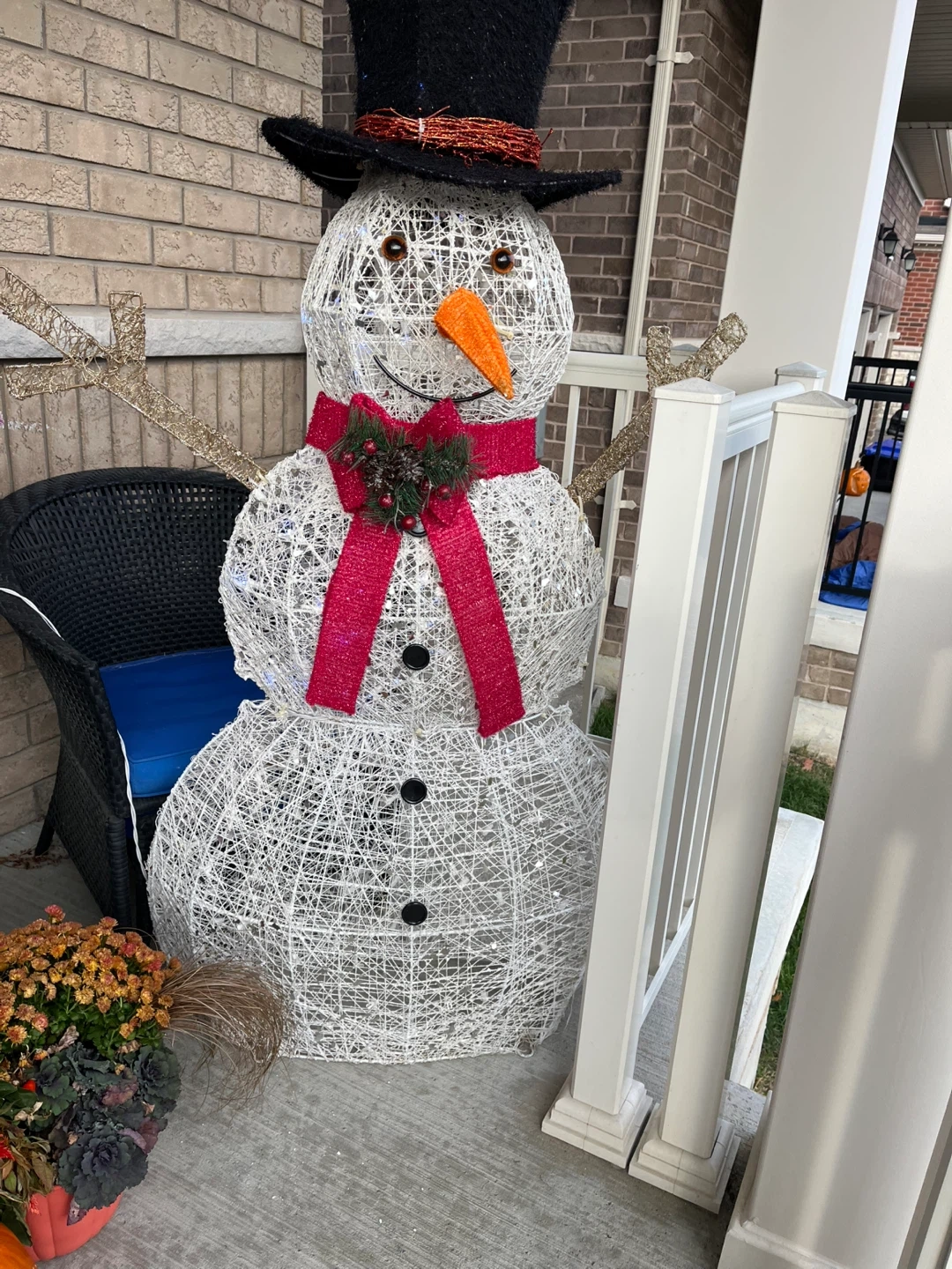 75Here's a decorative lighted snowman. It's perfect for adding a festive touch to your porch or indoor space during the winter season. The snowman features a top hat, carrot nose, and a red ribbon scarf. It's made of white woven material and is illuminated with lights. 5 ft tall
