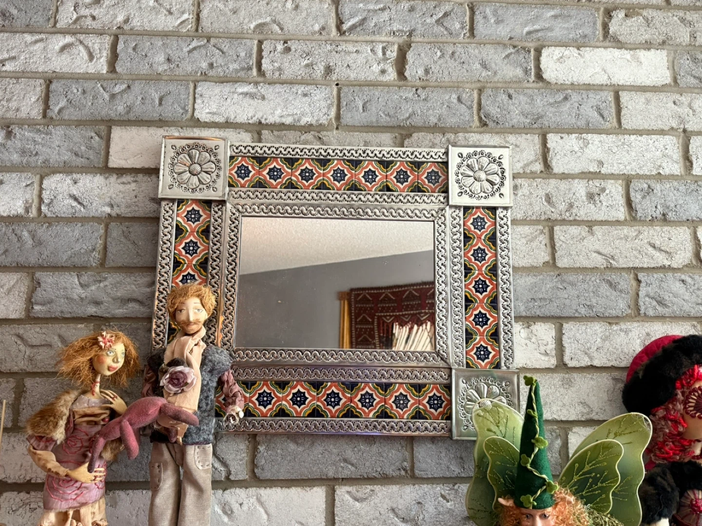 A lovely decorative mirror with a unique tile-inspired frame. It's in great condition and would add a touch of charm to any room