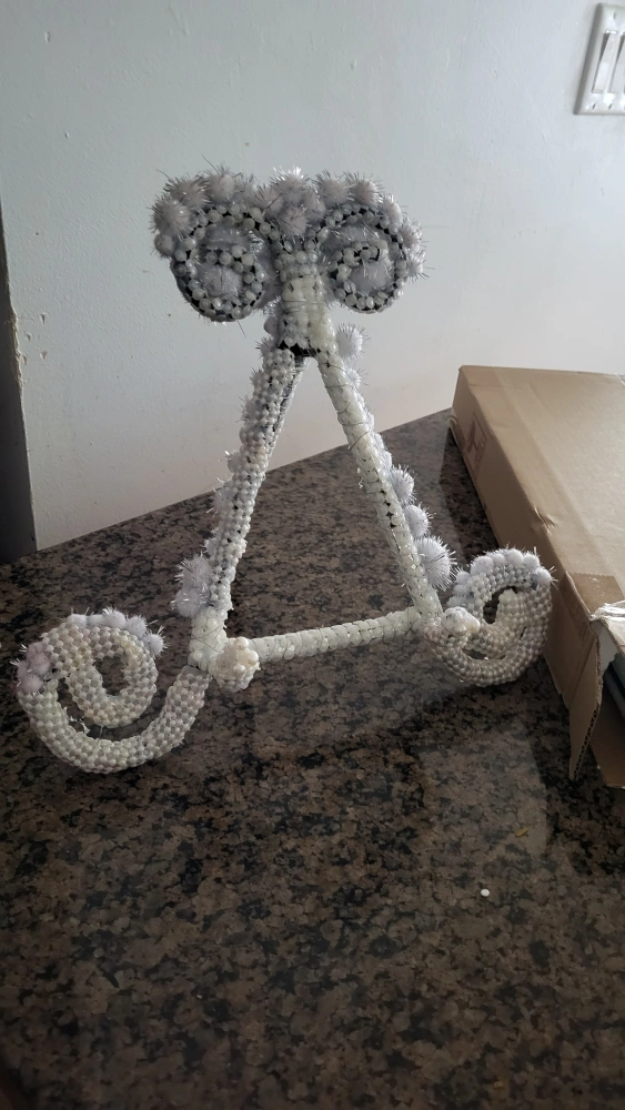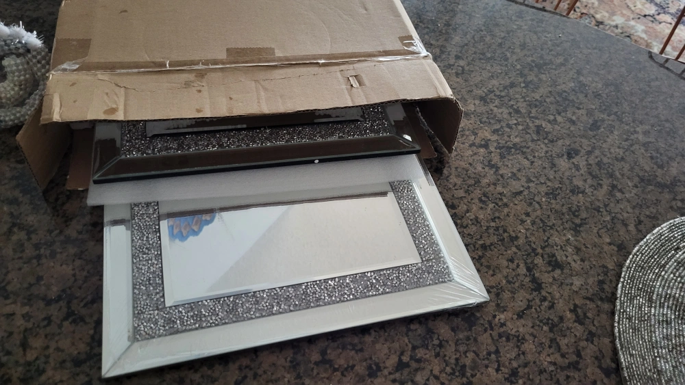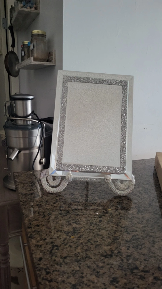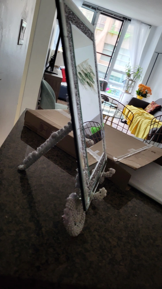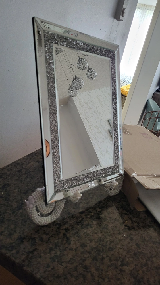 10Selling a lovely decorative mirror that comes with its own stand! It's in great condition and ready to add a touch of sparkle to your space. The mirror has a sparkly, jeweled trim that catches the light beautifully. It's a perfect accent piece for any room