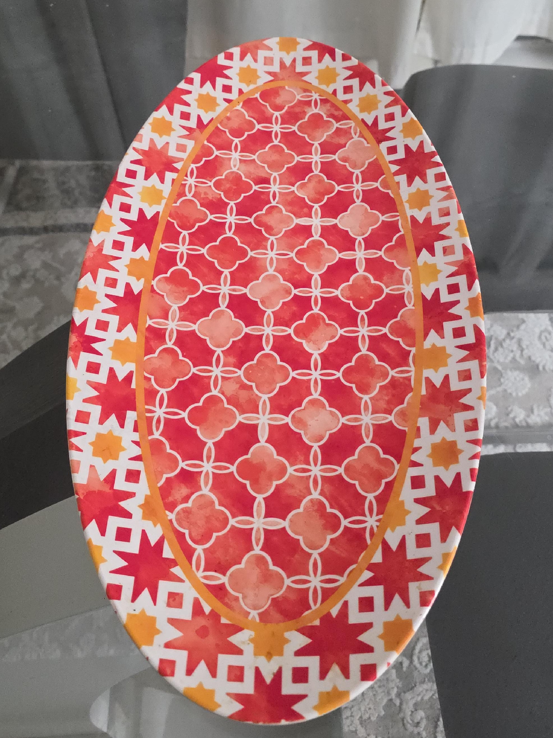 65Selling a decorative oval serving tray with a vibrant red and orange pattern. It's perfect for adding a pop of colour to your table or for serving snacks and appetizers. The tray is in great condition and ready for a new home