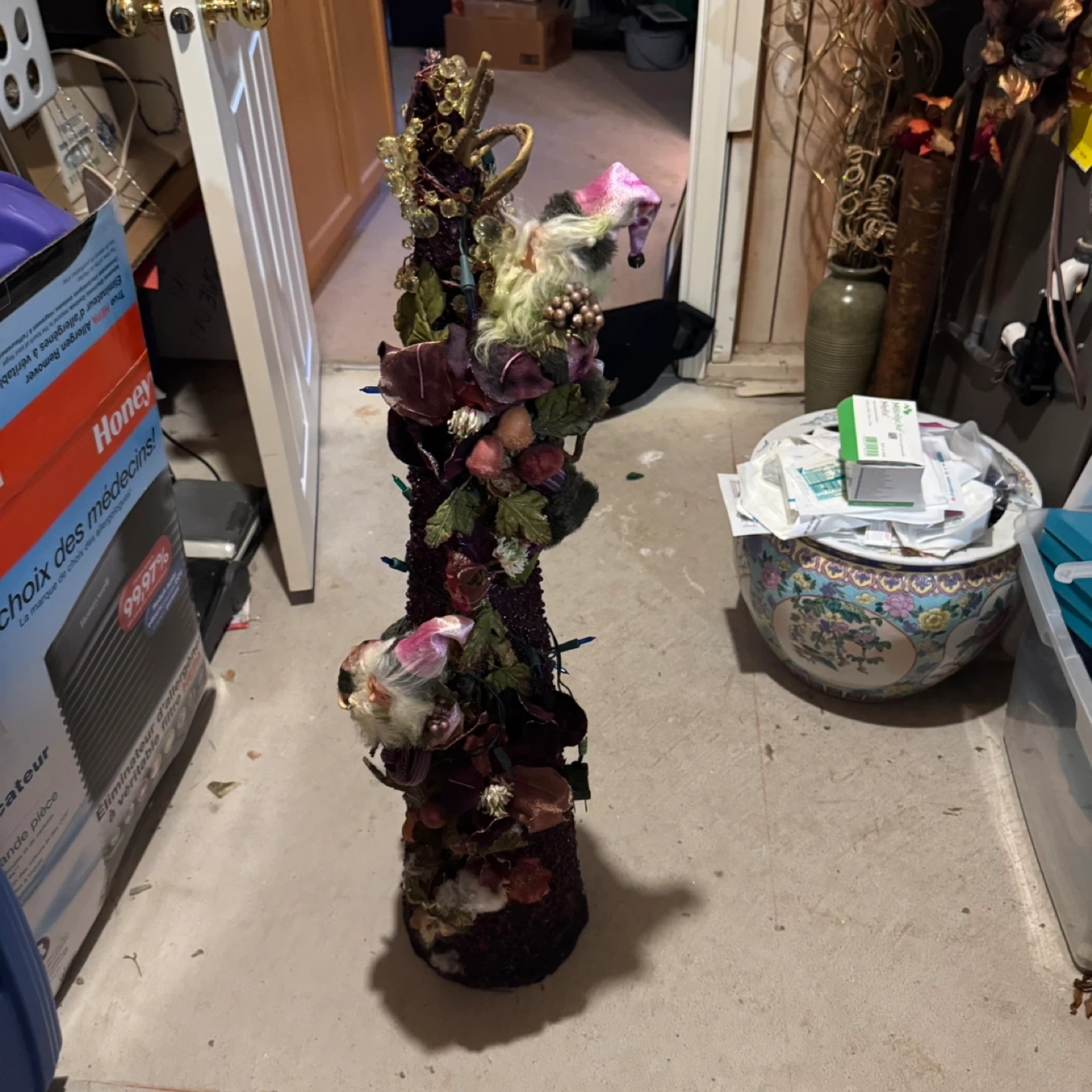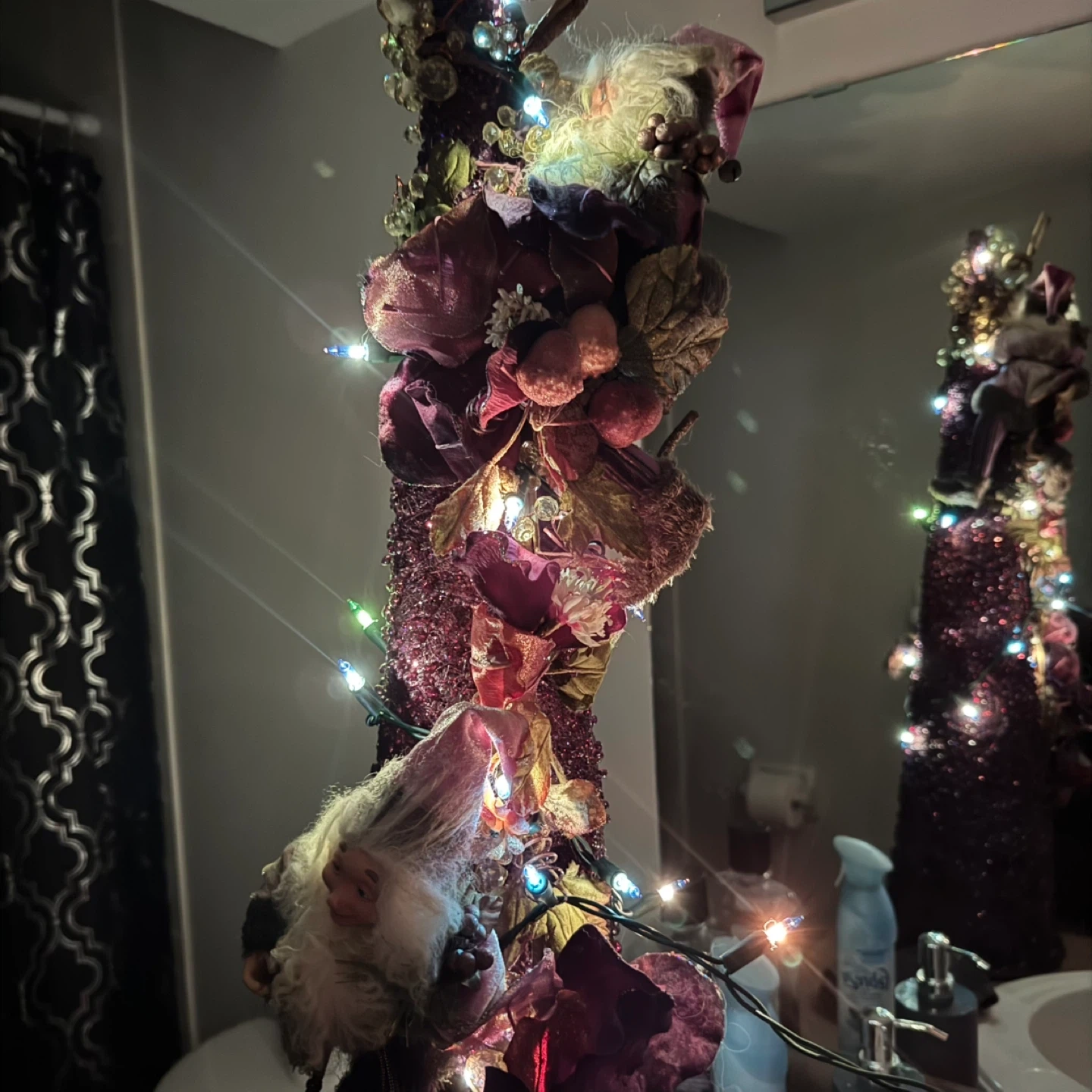 65Selling a unique decorative purple floral Christmas tree. It's adorned with flowers, leaves, fairies and fairy lights, perfect for adding a festive touch to any room during the holidays