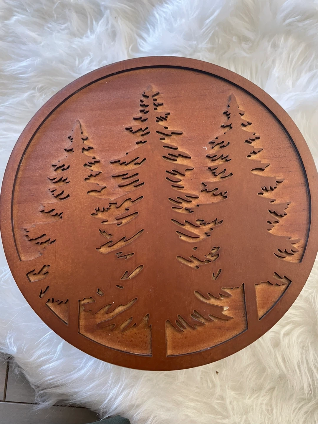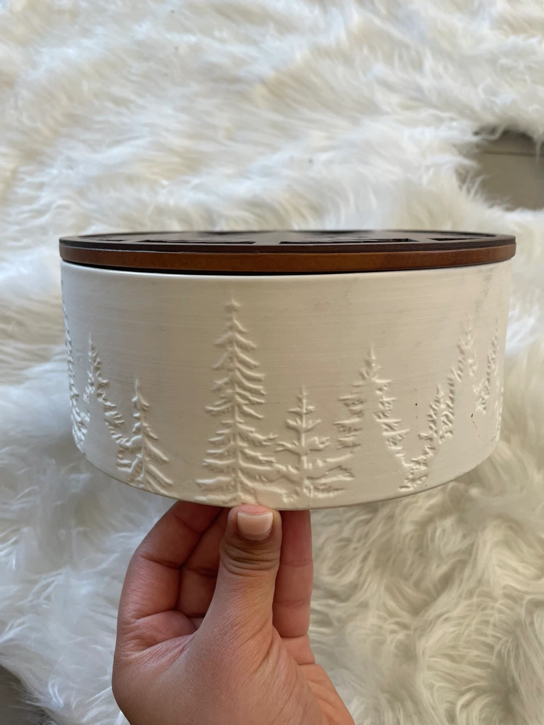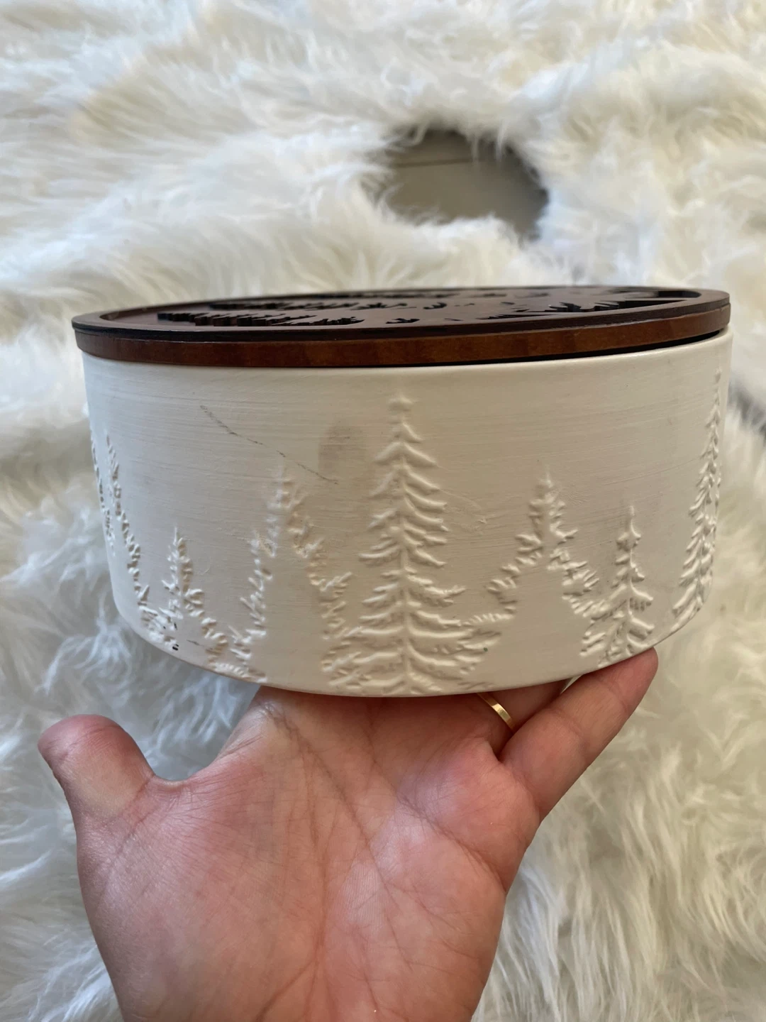 This is a lovely decorative round box featuring a tree design on the lid and sides. The lid is a warm brown wood, and the base is white with embossed trees. It's a great piece for adding a touch of nature to your home decor