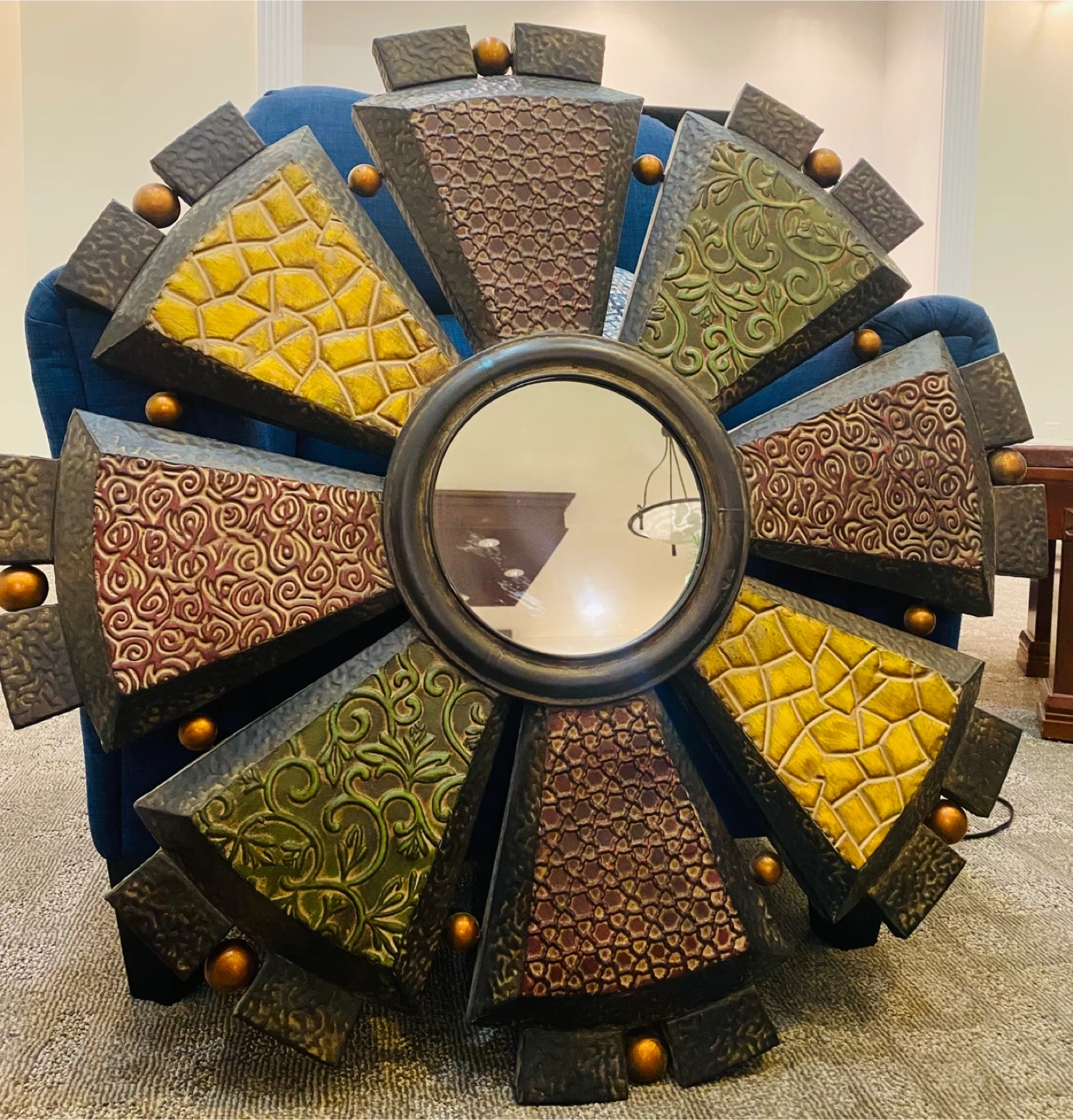 0Unique decorative wall mirror with a round centre and textured, colourful segments surrounding it. It's in great condition and would make a lovely addition to any room