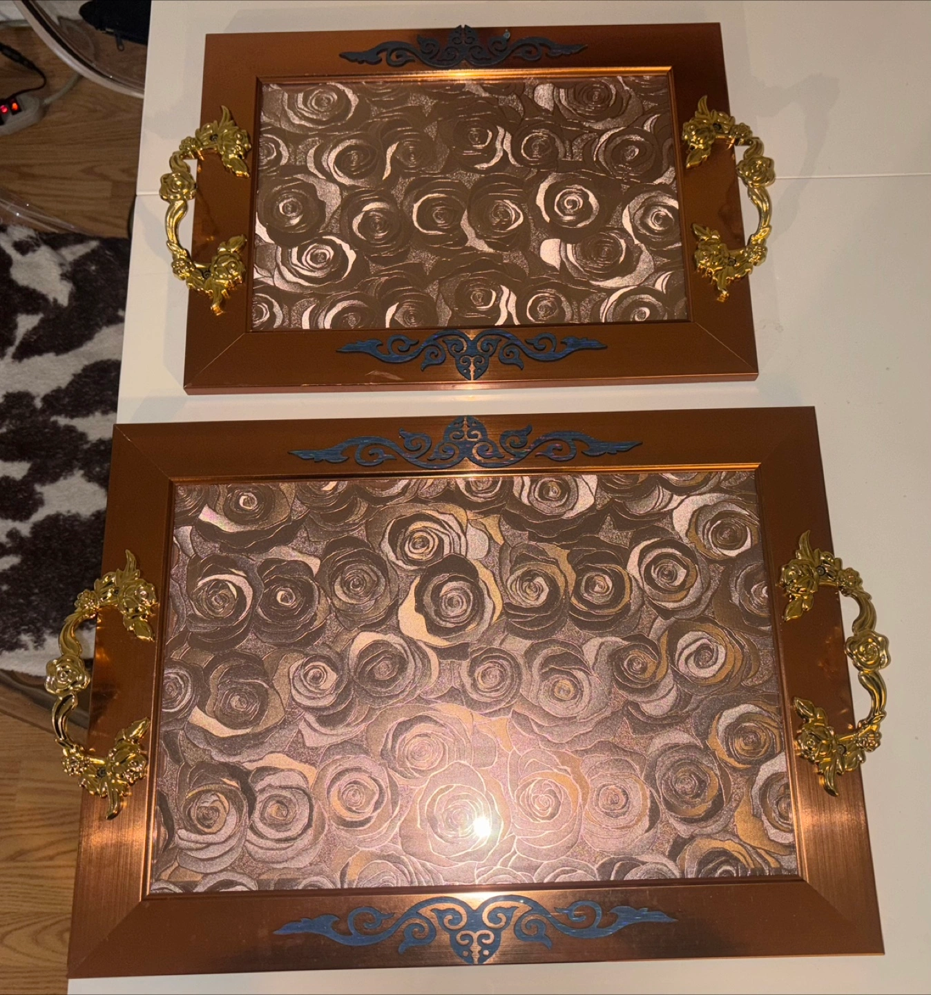 Selling a set of two decorative serving trays! They feature a beautiful rose pattern on the surface, bronze-coloured frames, and ornate gold handles. These trays would be perfect for adding a touch of elegance to your home decor or for serving guests in style