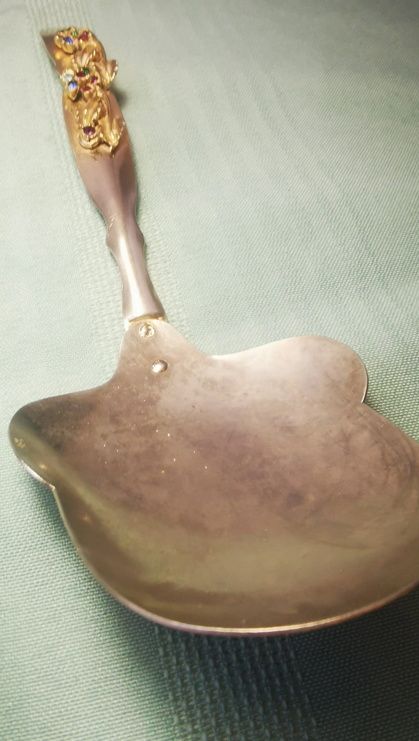 This decorative serving utensil from the 1950s exudes a Hollywood Regency style with its multi-color design and gemstone handle pattern by Sheffield Silver Co. in Brooklyn, NY. The silver-plated cake/pie slice server is 7.5 inches long, 2.5 inches wide at the bowl adds an elegant touch to any occasion, especially a wedding. Made in the United States, this unique piece is a vintage treasure for those who appreciate classic and luxurious decor. CONDITION: Good vintage condition with expected metal ware please reference detailed pictures as part of the description