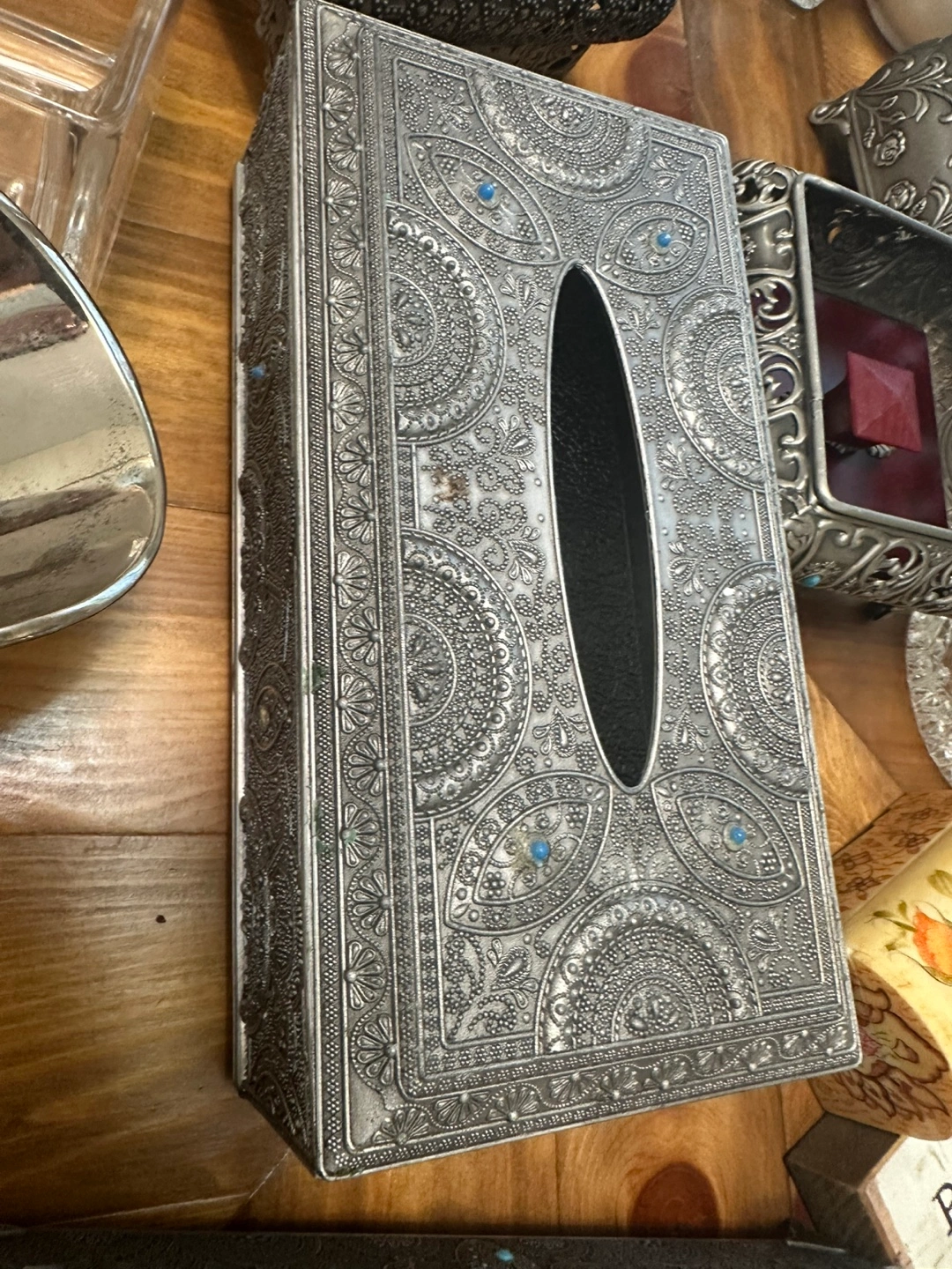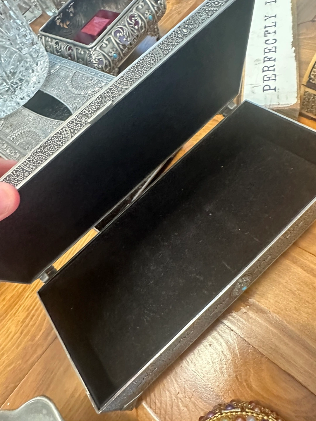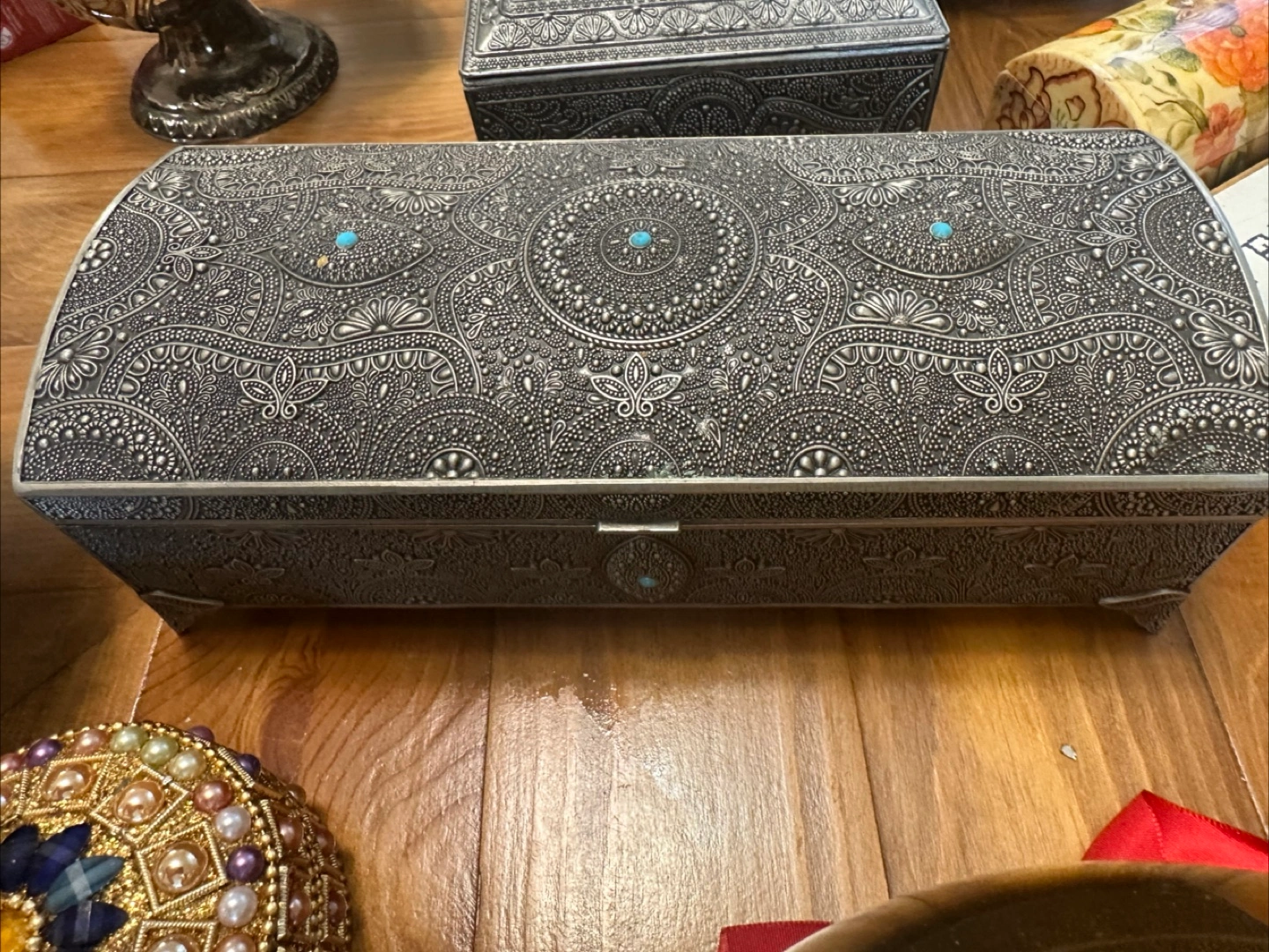 A collection of decorative silver-toned metal boxes with intricate designs. Great for storing jewelry, trinkets, or as a unique decor item for your home!