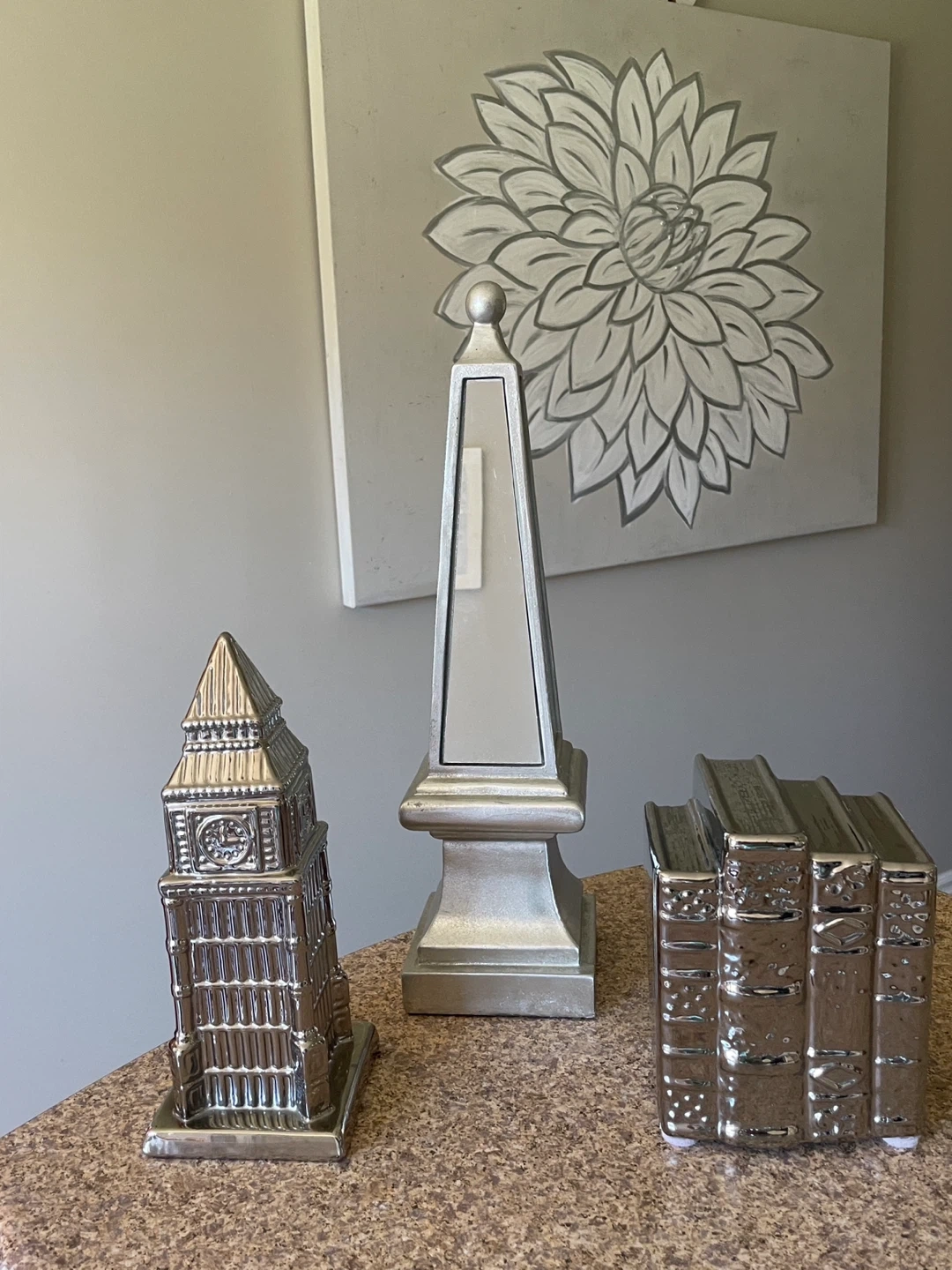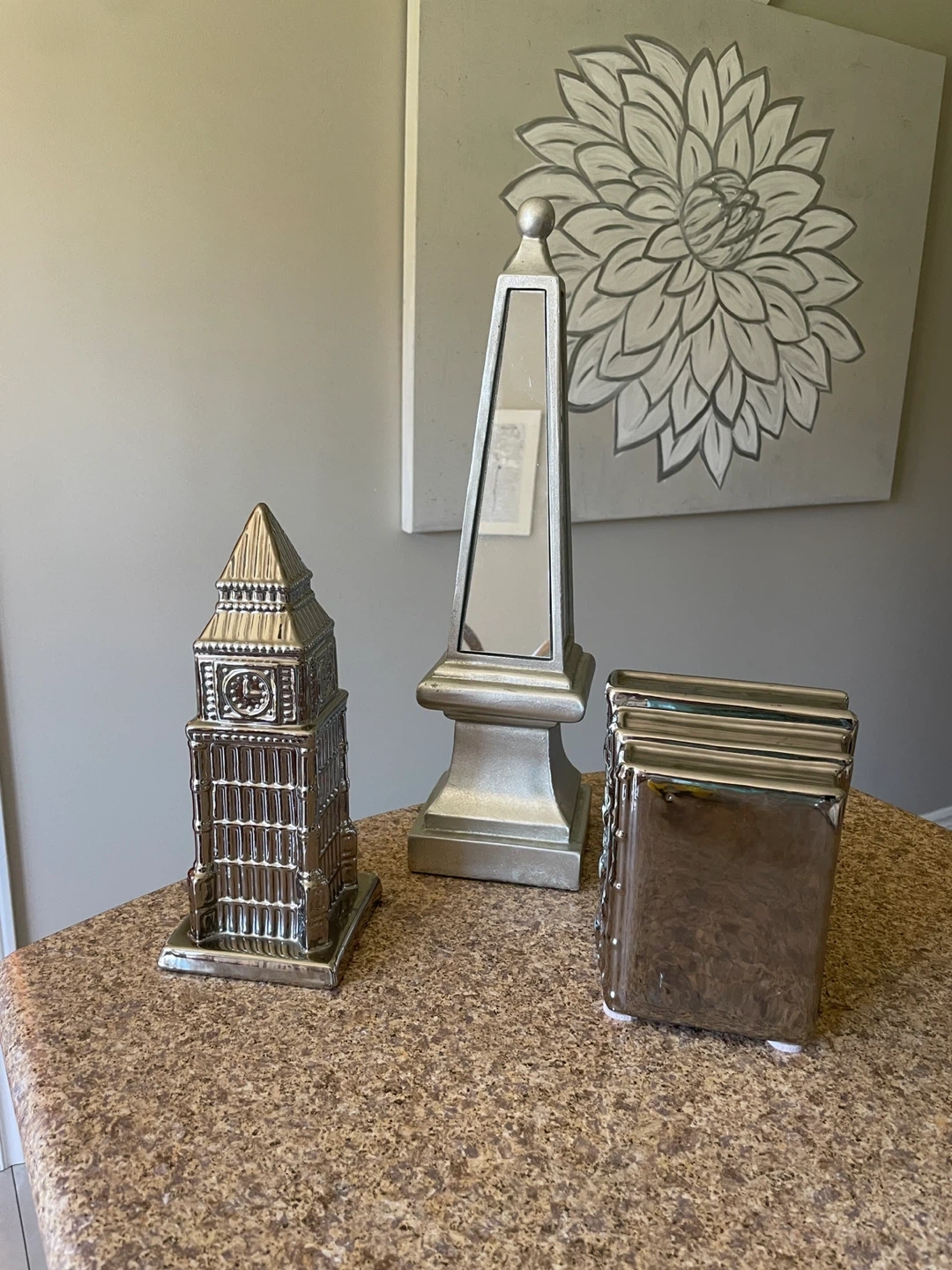 Add a touch of elegance to your home with these silver tabletop ornaments! Included are a Big Ben replica, an obelisk mirror, and a stack of books! They're in great condition and ready to brighten up any space All for $30