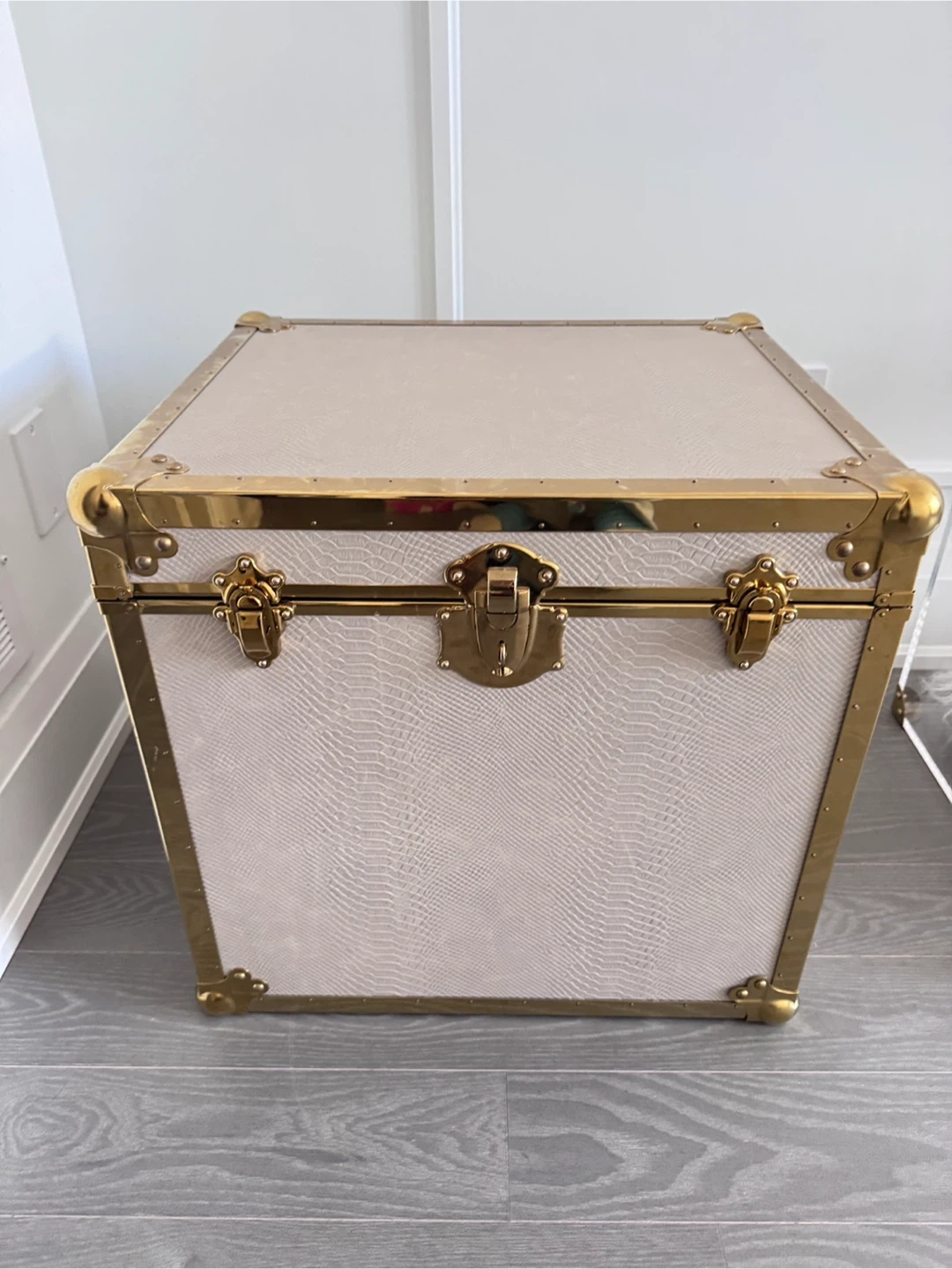 51Selling a stylish decorative storage trunk! It features an ivory exterior with a subtle snakeskin pattern and elegant gold hardware. The interior is a warm wood tone. Perfect for adding a touch of sophistication to any room while providing practical storage! Dimensions: 57cm x 50cm x 54cm Location: Hwy 7 and Bayview