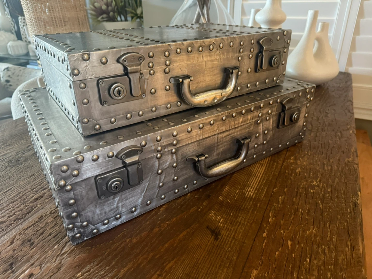 Selling a set of two decorative suitcases. These are great for adding a vintage touch to your home decor or for use as storage. They feature a metallic finish with rivet details and sturdy handles. The inside is lined with black fabric. Perfect for adding a unique touch to any room! Smaller case dimensions: 19” wide X 12”deep x 5” high
