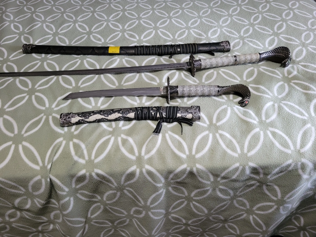 Selling a decorative sword set featuring unique cobra head handles. The set includes two swords and two sheaths. The handles are intricately designed, adding a distinctive touch to the set. Perfect for display or collection!