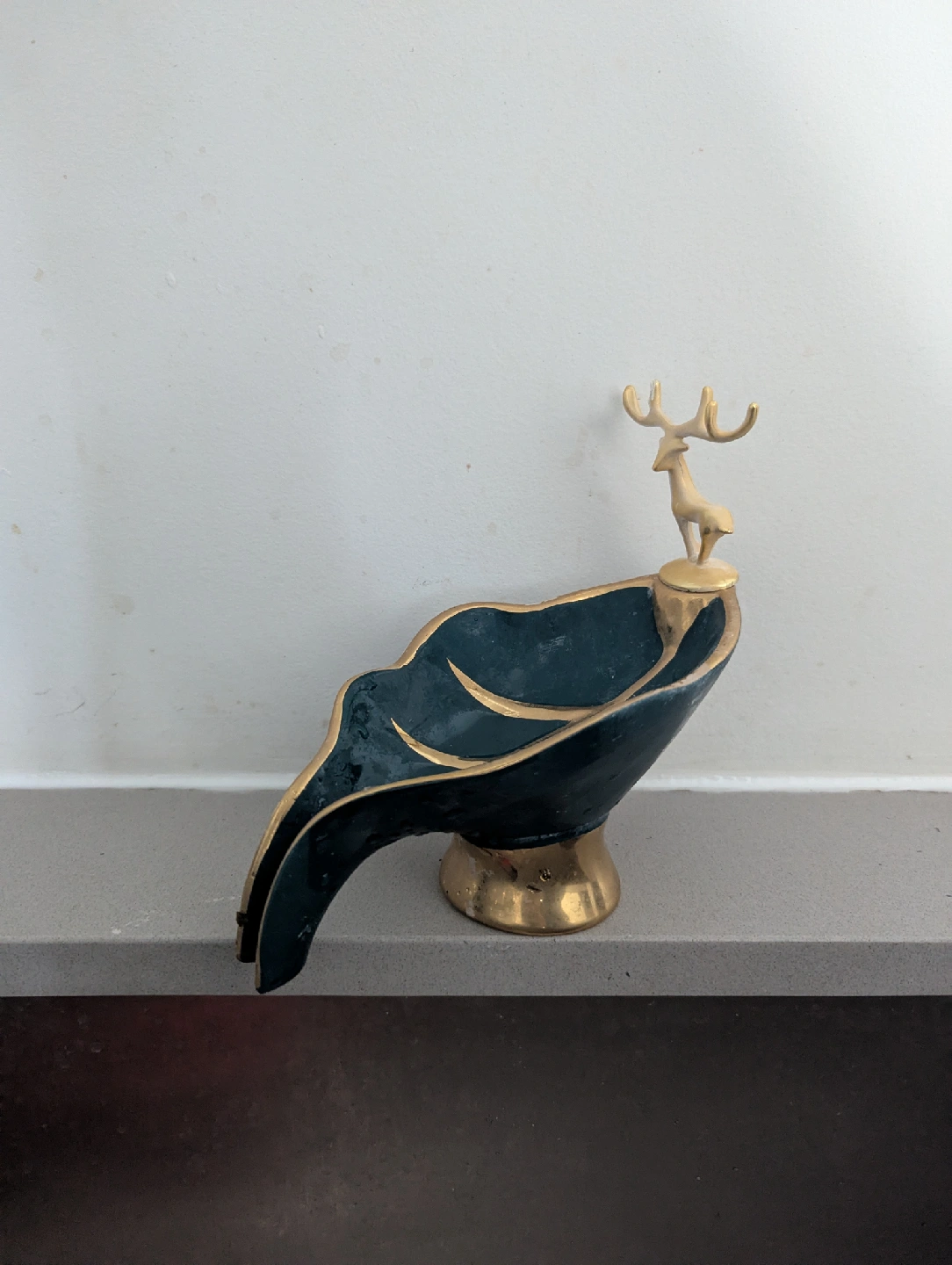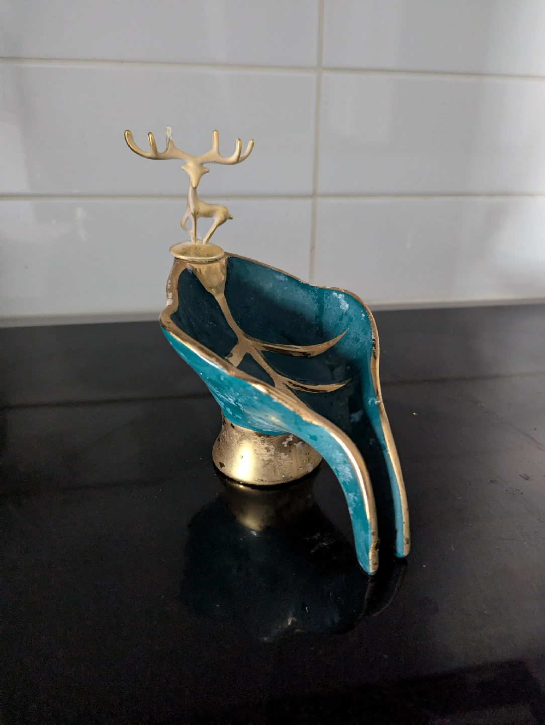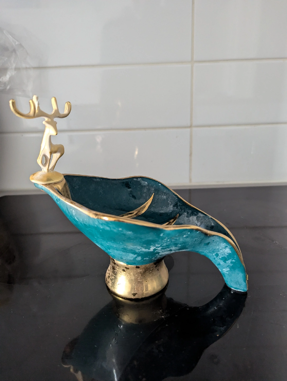 A unique decorative bowl featuring a teal and gold colour scheme with a small deer figurine accent. It's in great condition and would make a lovely addition to any home decor. it drains the water right into the sink when you put soap or a sponge on it. no mess or stains on your countertop