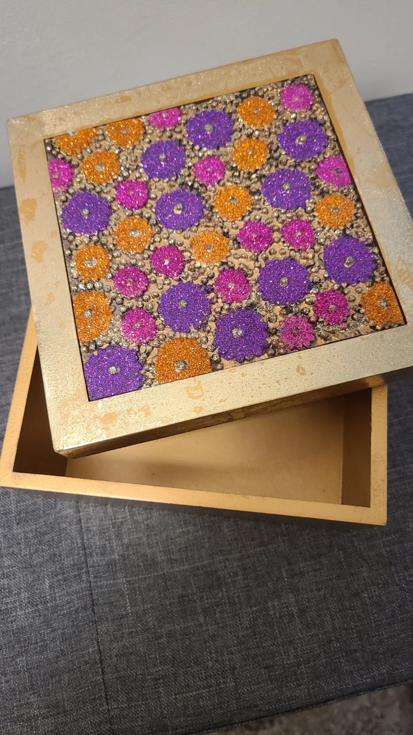 32Selling a decorative box with a colourful floral design on the lid! The box itself has a distressed golden finish and is in new condition. Perfect for storing small items or as a decorative piece. It is 6x6x4"