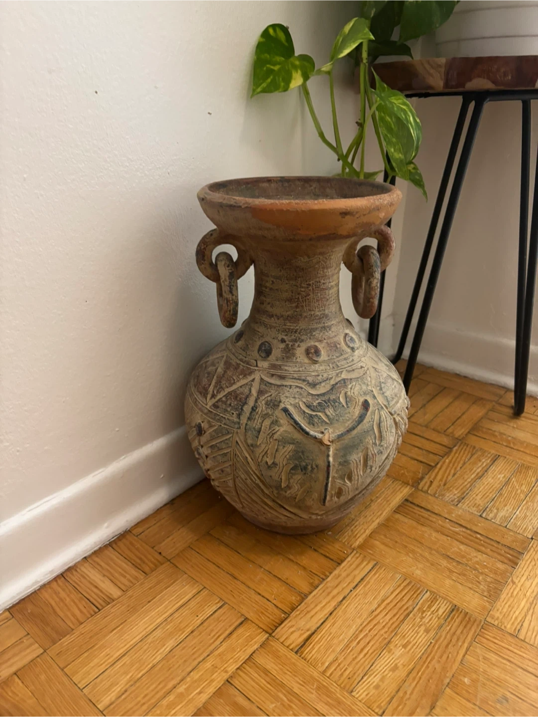 68Selling a unique decorative vase! It has a rustic, earthy look with interesting patterns and handles. It would look great as a centrepiece or accent piece in your home