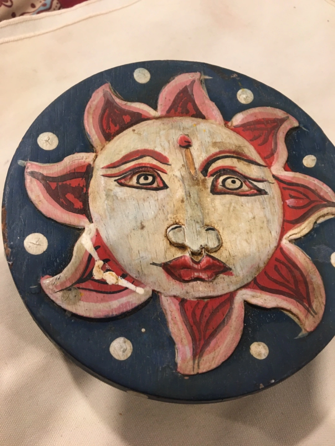 Decorative wooden box with a cheerful sun. Cash only please