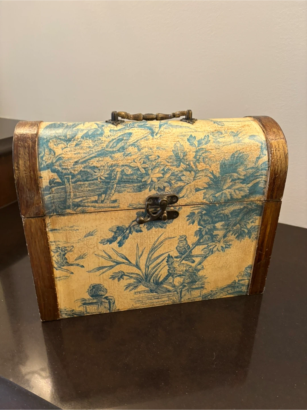60This is a charming decorative wooden storage box, perfect for adding a touch of elegance to any room. It features a beautiful blue and cream toile pattern, with a red interior. It's great for storing small items or as a decorative piece on its own