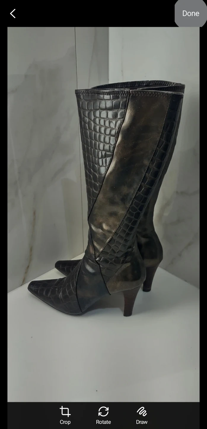 1000+These are a pair of brown knee-high boots in a size 8. They have a unique crocodile-like texture. Perfect for adding a bit of style to your wardrobe! These are brown boots close to a burgundy color, which can add a pop of color to winter neutrals like black, gray, and brown. Purchase price $180